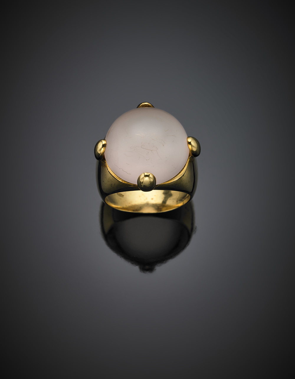 *Anello in oro giallo e quarzo rosa satinato, g 13,56 misura 15/55.