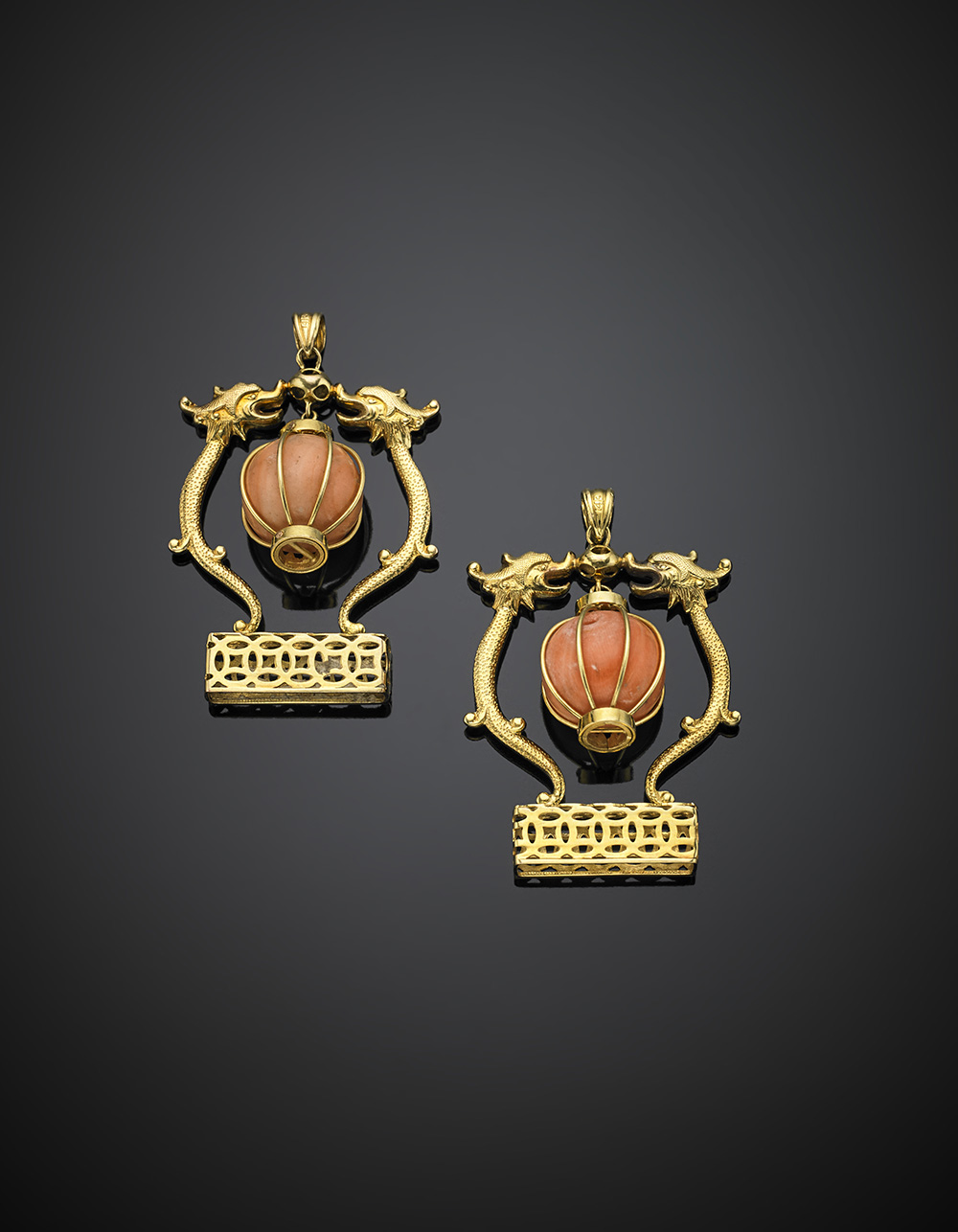 Due pendenti in oro giallo 585/1000 e corallo rosa a guisa di lanterne cinesi, complessivi g 19,4, lungh. cm 4,5, largh. cm 3 circa.
