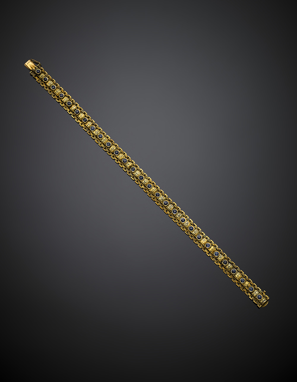 Yellow partly chiselled gold and sapphire supple bracelet, the chasing is accented with black enamel, g 16.44, length cm 20 circa. (slight defects)