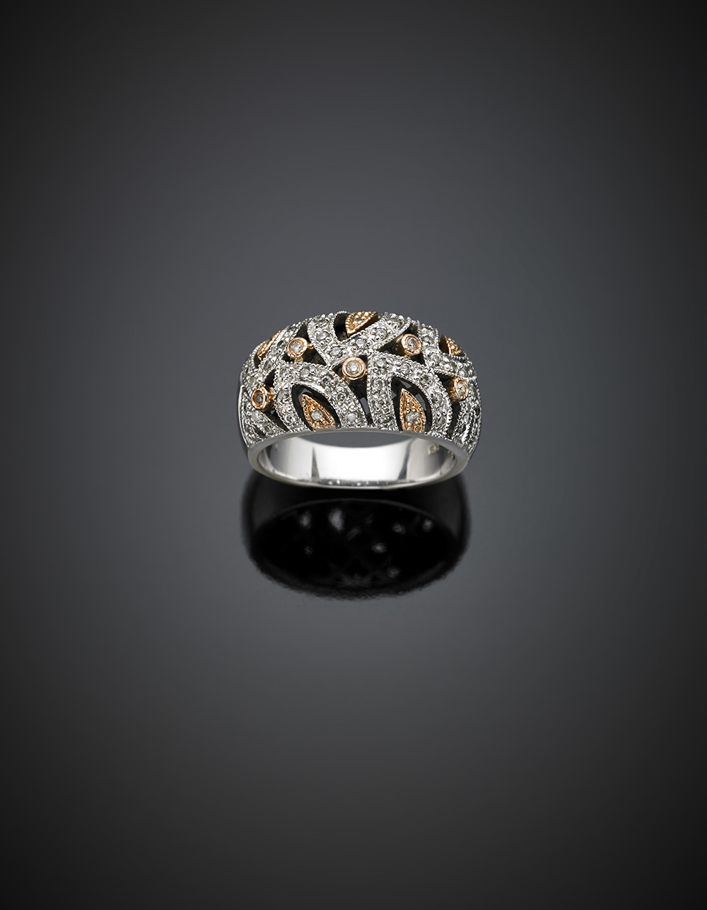 Anello in oro 585/1000 bianco e rosa con diamanti, g 8,37 misura 13,5/53,5. Marcato BH.