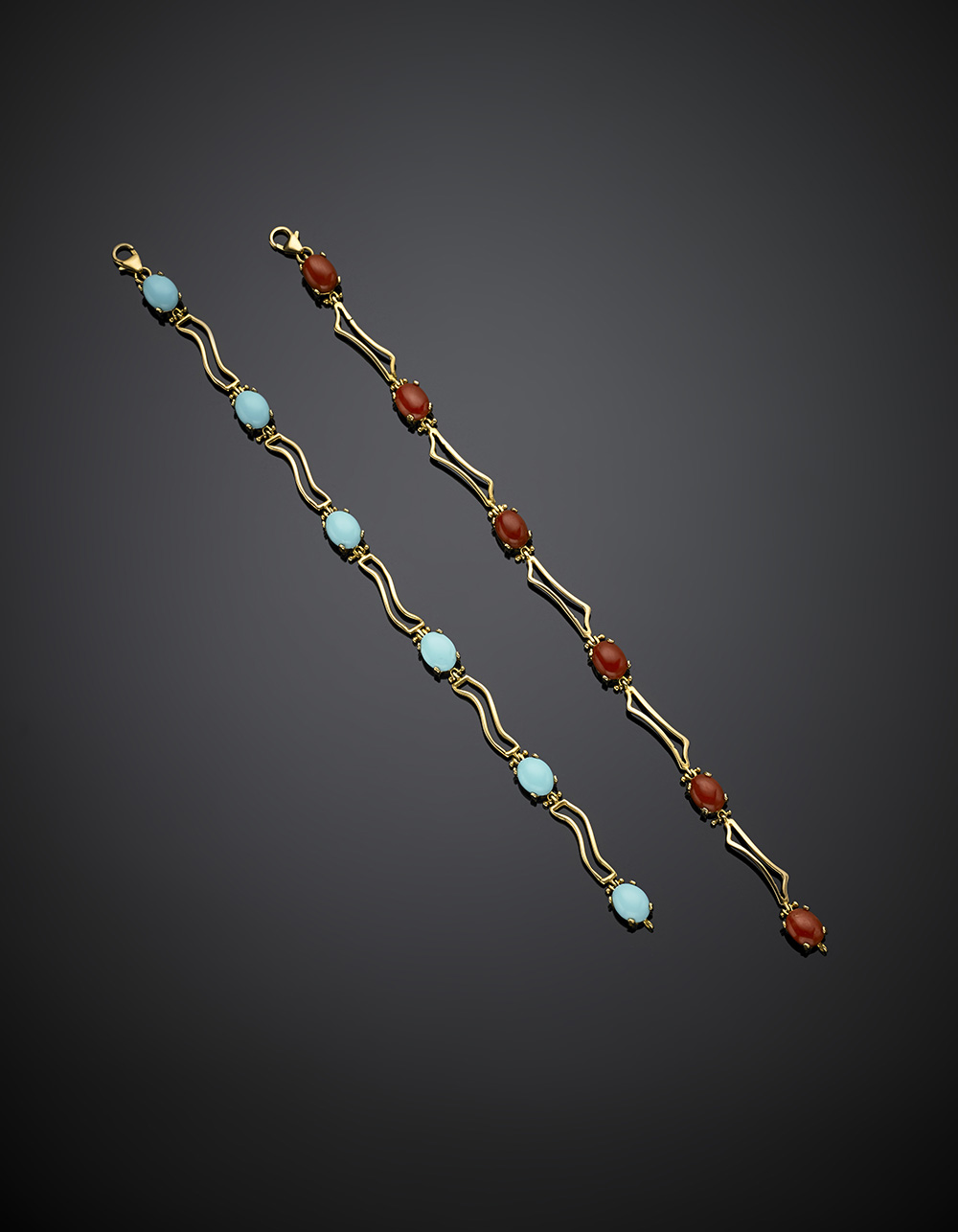 Lotto di due bracciali in oro giallo, uno con coralli ovali cabochon e l'altro con turchesi ricostituiti ovali cabochon, complessivi g 18,78, lungh. cm 18,50 circa.