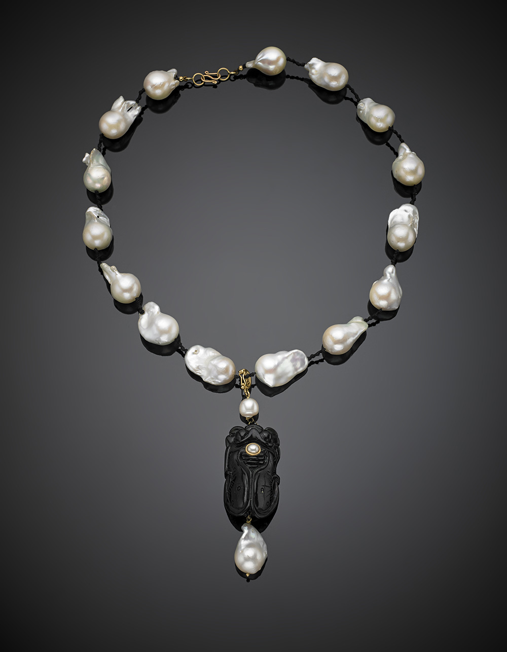 Collana di perle irregolari con pendente in nefrite scolpita a guisa di...