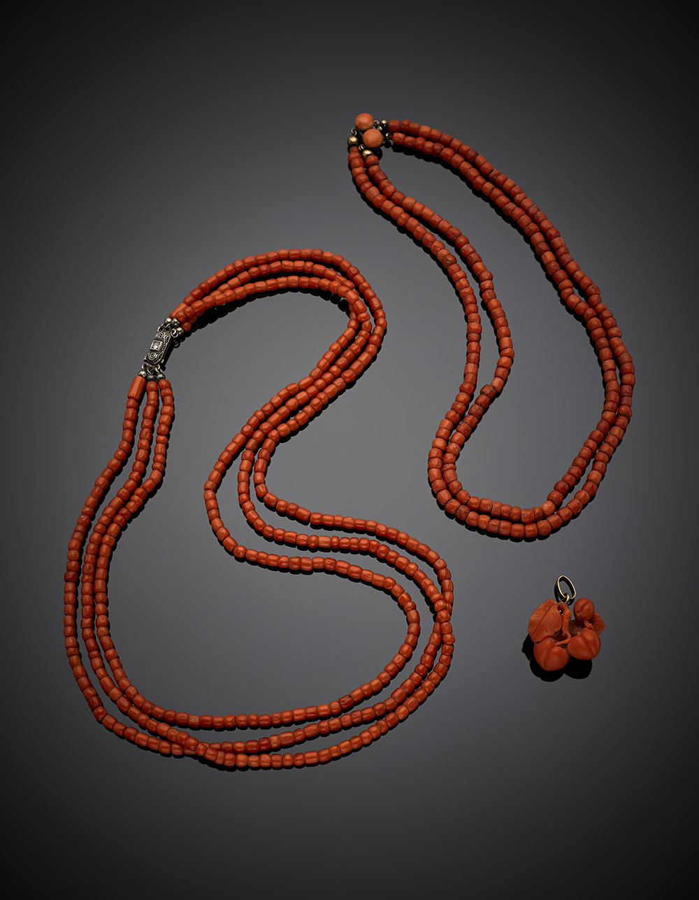 Lotto in corallo arancione composto da una collana a due fili, una a tre fili e da un pendente scolpito di corallo, le chiusure in argento, complessivi g 97,72.