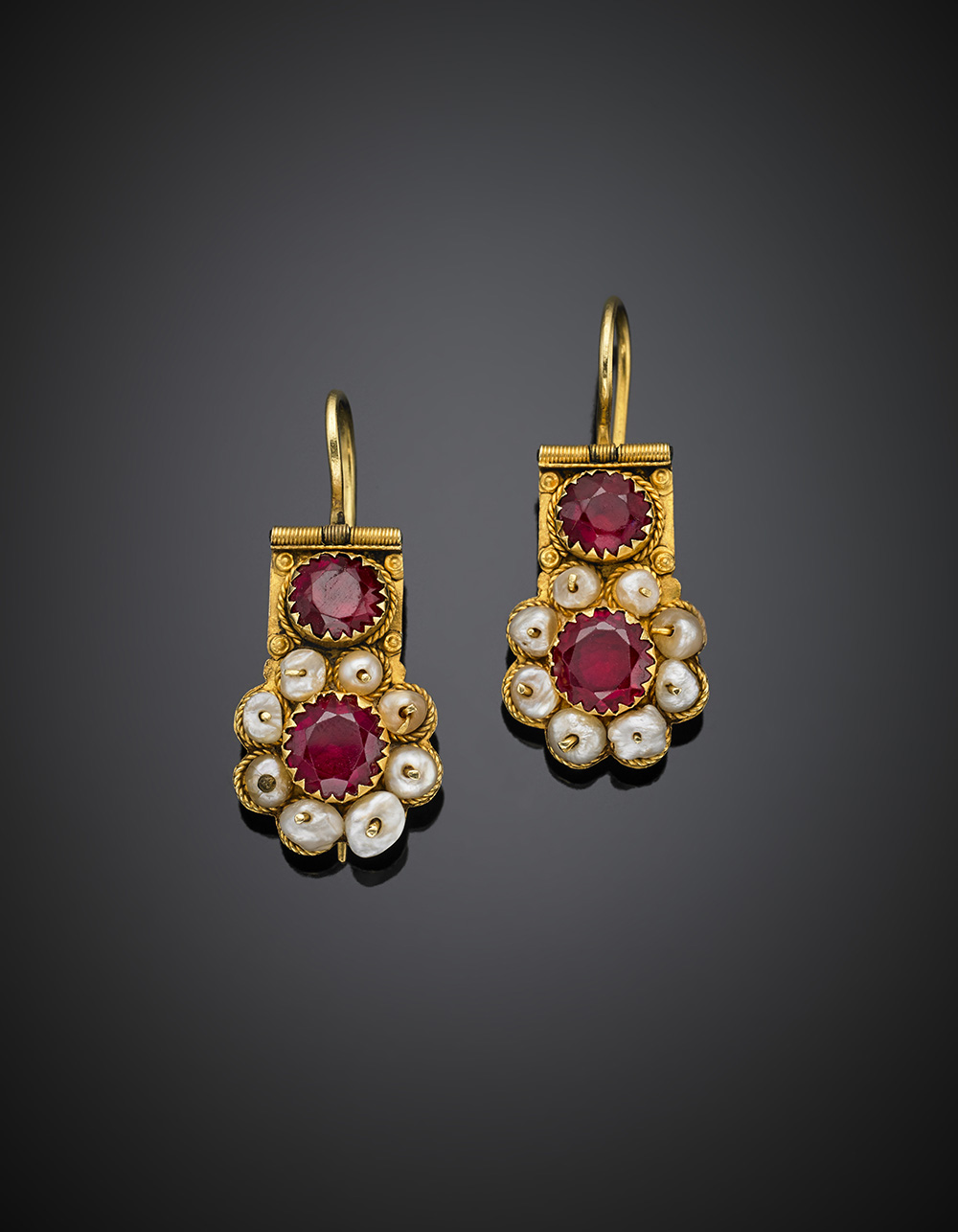 Orecchini pendenti in oro giallo rifiniti con perle e rubini sintetici, g 14,35, lungh. cm 4,2 circa. (difetti)