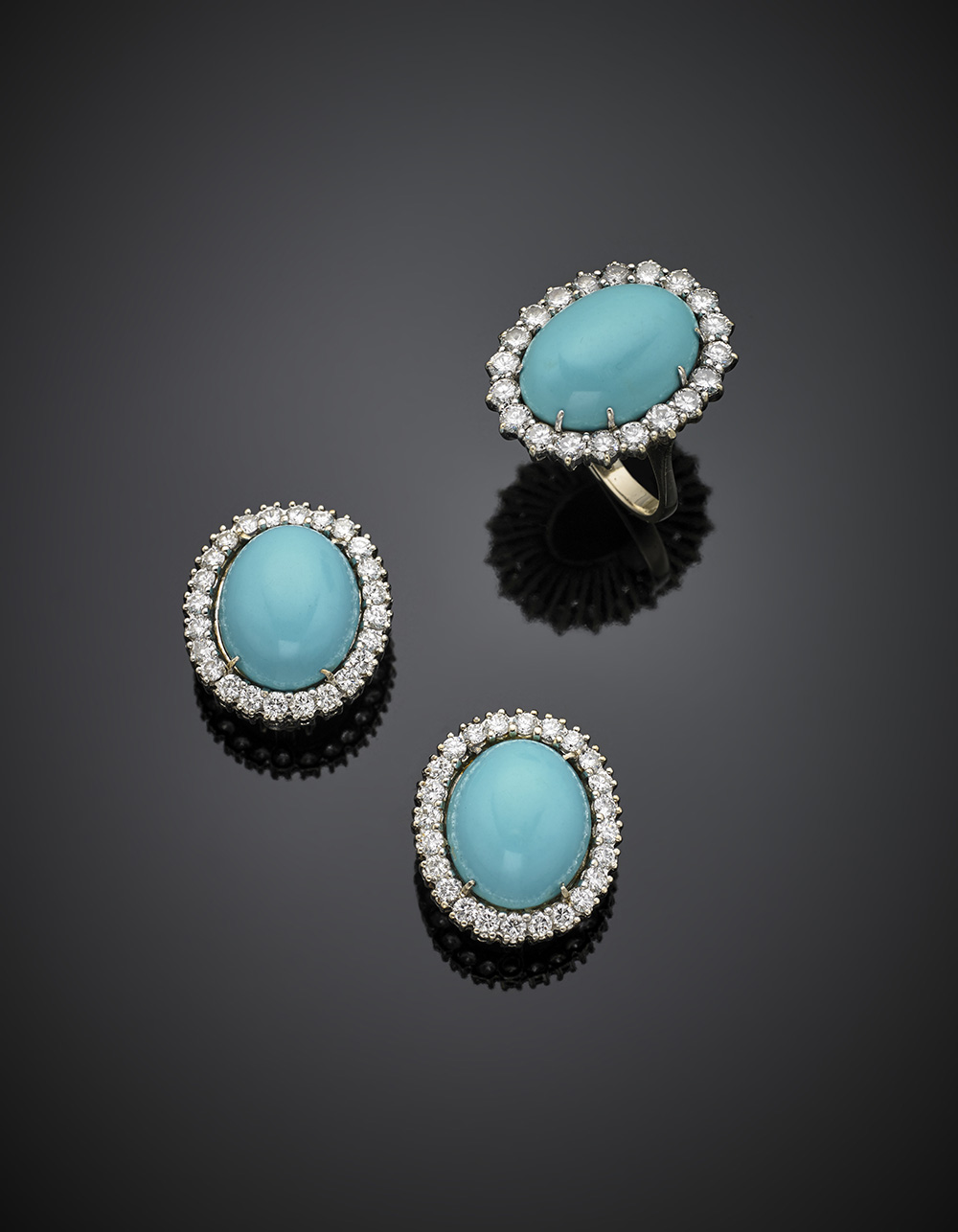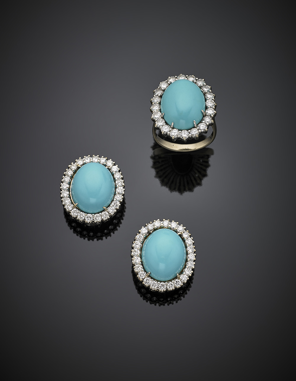 Cabochon composite turquoise and diamond white gold cluster jewelry set comprising earrings and ring, diamonds in all ct. 4.50 circa, in all g 18.74, length cm 2.30 circa size 13/53. The earrings signed Pederzani.