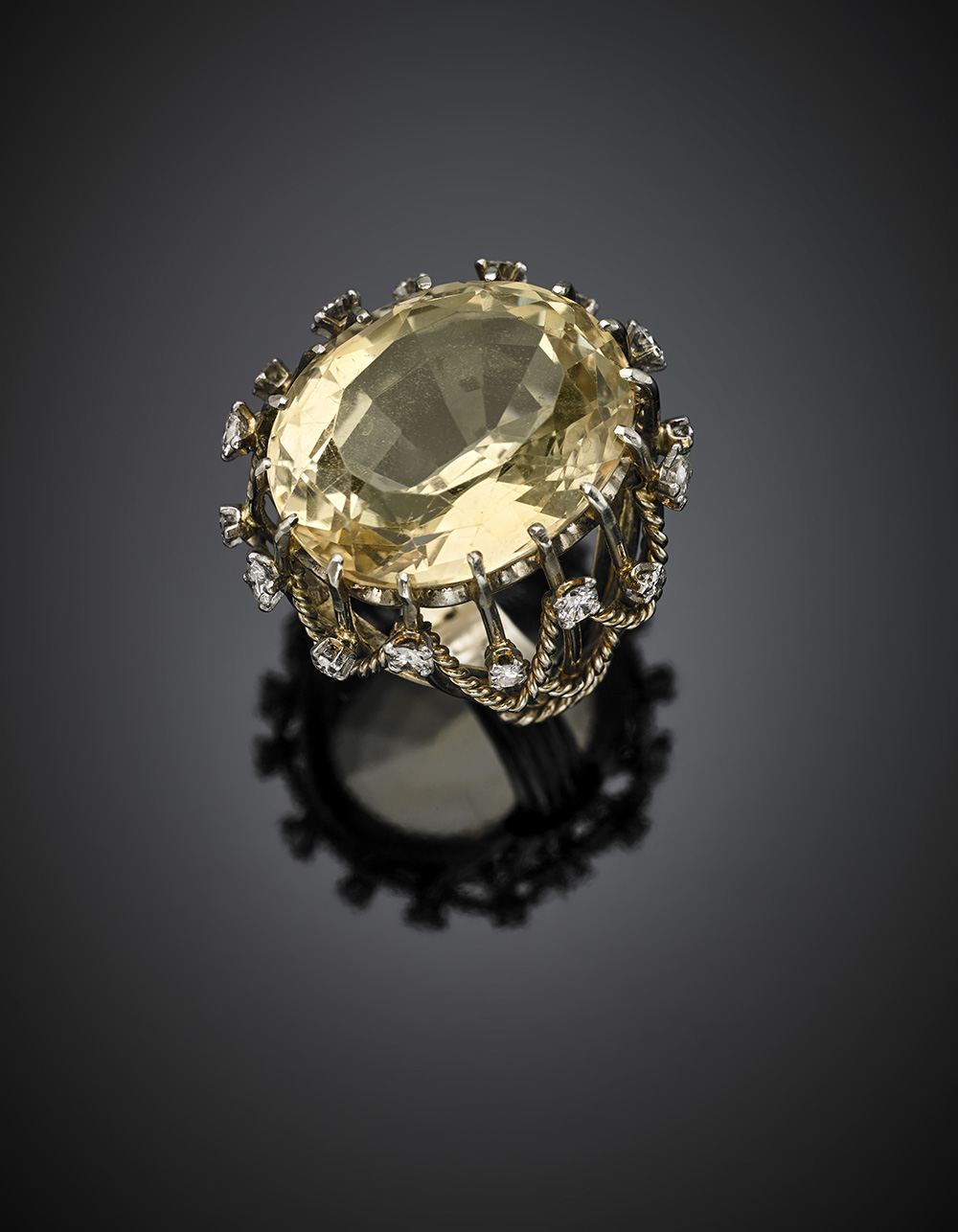 Anello in oro giallo a cestino con quarzo citrino ovale e diamanti per complessivi ct. 0,70 circa, g 17,56 misura 11/51.