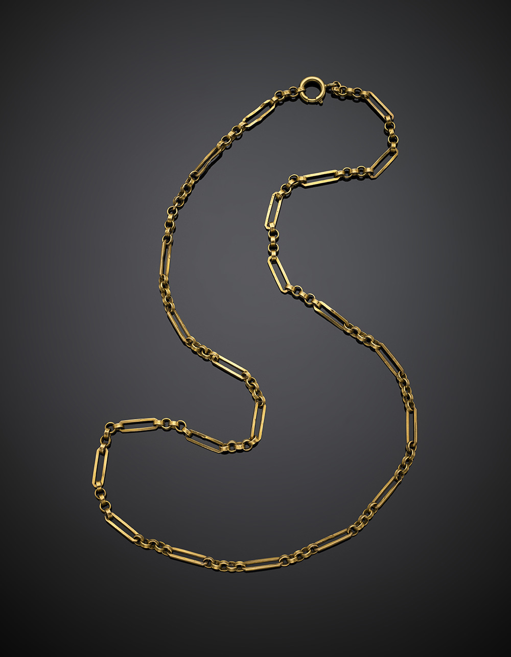 Catena ad anelli e losanghe in oro giallo, g 9,88, lungh. cm 65,50 circa. (difetti)