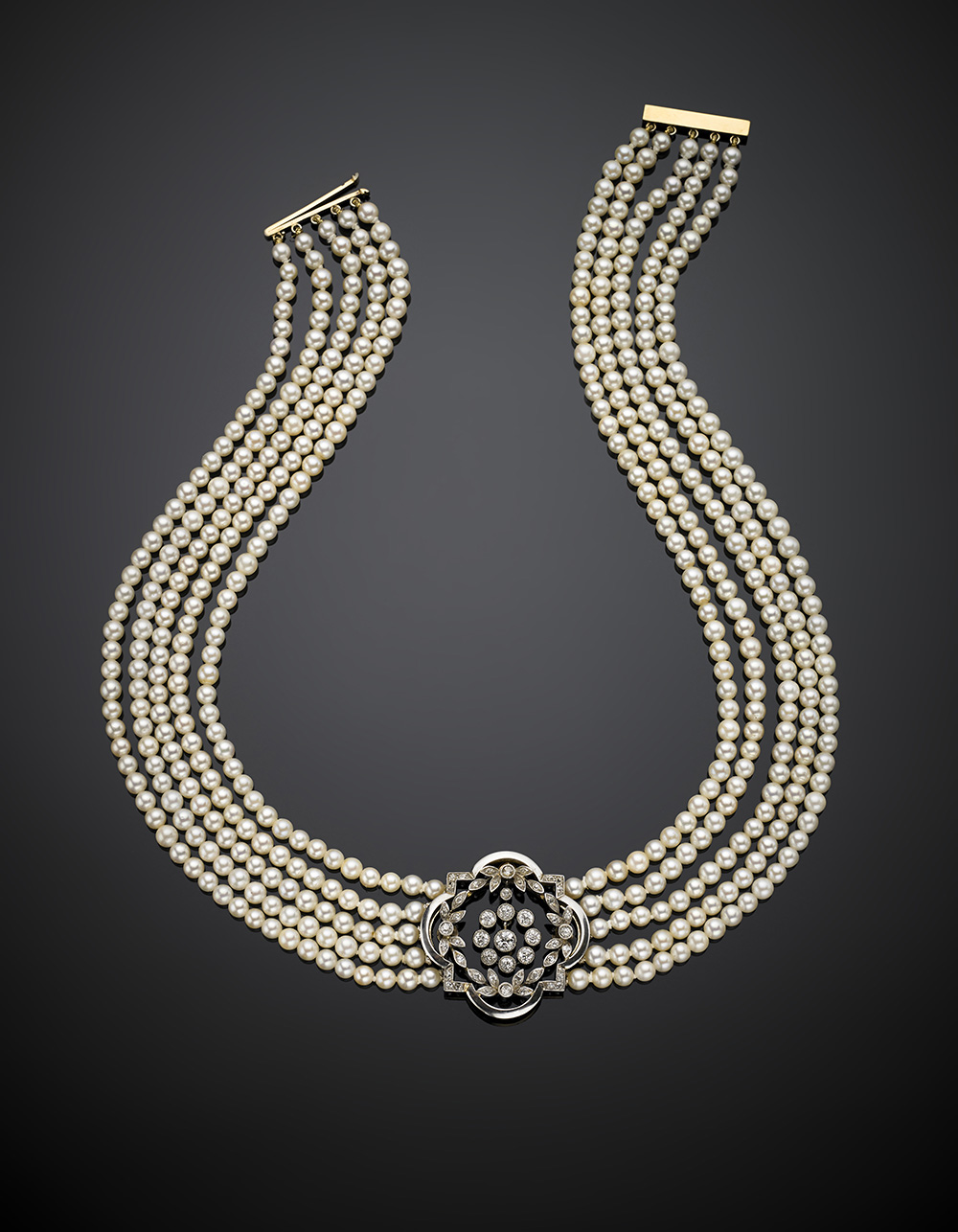 Collier de chien a cinque fili di perle con centrale/pendente in oro giallo, bianco e diamanti, chiusura in oro giallo, g 61,81, lungh. cm 40 circa.