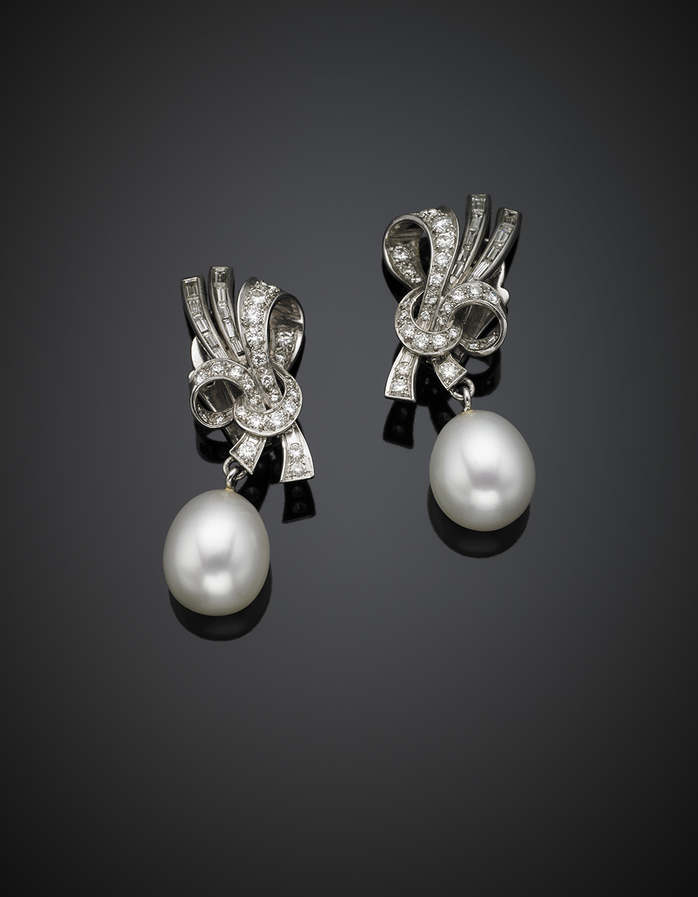 Orecchini pendenti a guisa di nastri in oro bianco, diamanti rotondi e a baguette a tenere due perle bianche ovoidali di mm 15.30x12.60 circa, diamanti per complessivi ct. 1,30 circa, g 24,07, lungh. cm 4,5 circa.