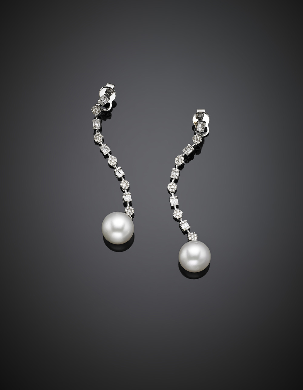 Orecchini pendenti in oro bianco con diamanti rotondi e a baguette a tenere due perle di mm 12 circa, diamanti per complessivi ct. 1 circa, g 10,37, lungh. cm 7 circa.
