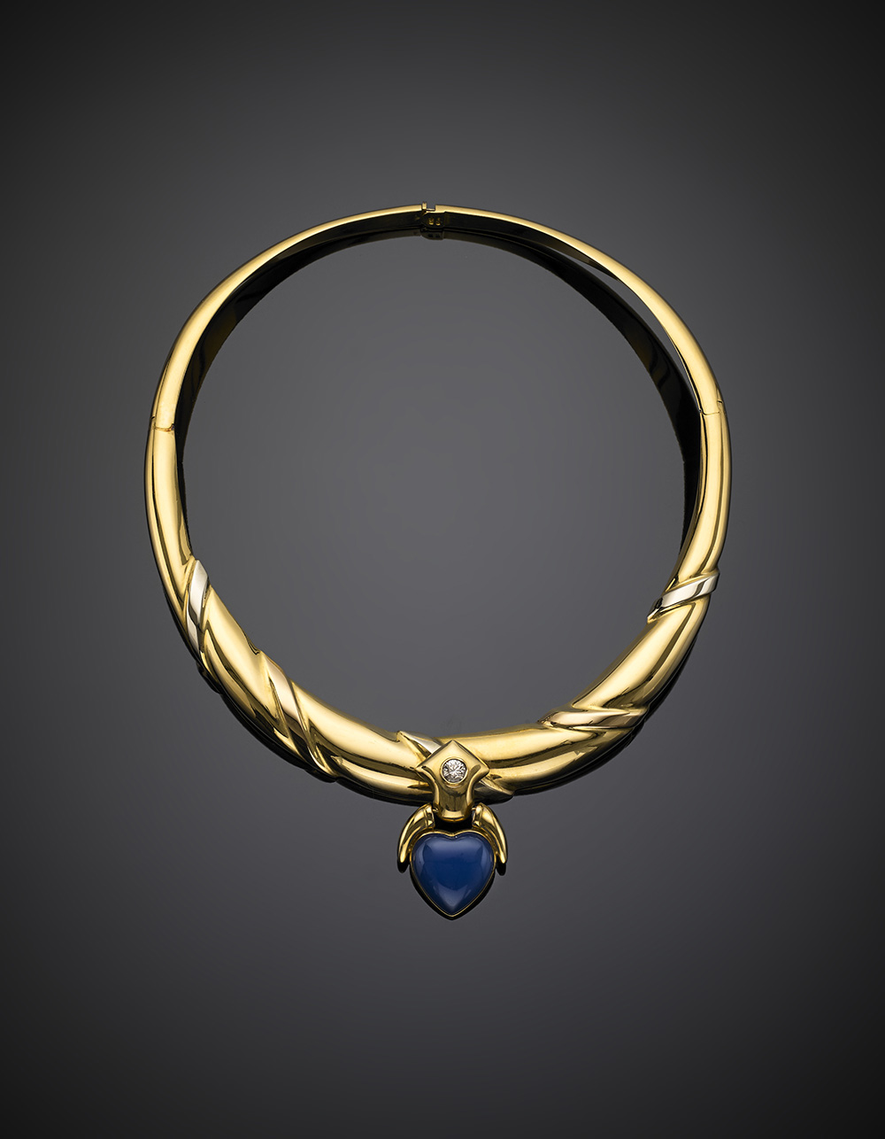 Collier in oro giallo, rigido, apribile con calcedonio blu a cuore e diamante...