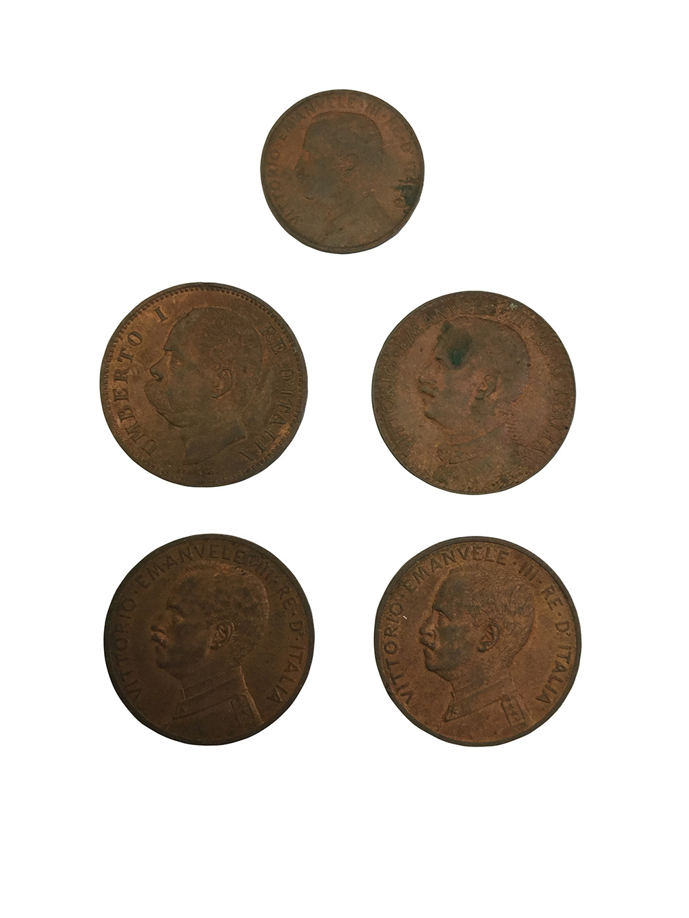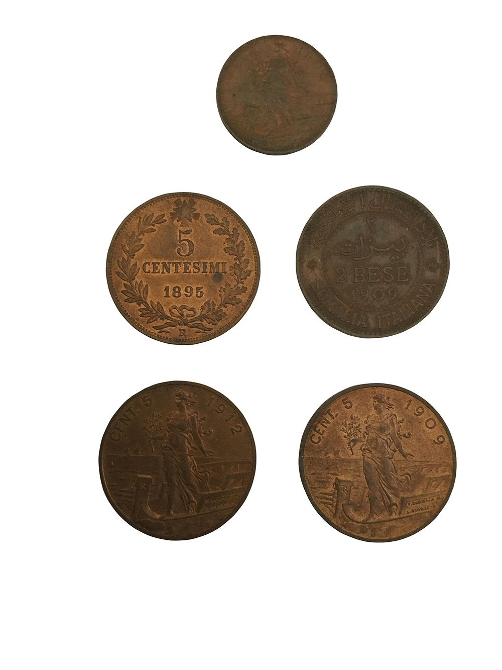 5 monete in rame: Umberto I, 5 centesimi 1895; Vittorio Emanuele III, 5 centesimi 1909 e 1912, 2 centesimi: 1908 Prora, 2 bese 1909 Somalia. da SPL a FDC rosso.