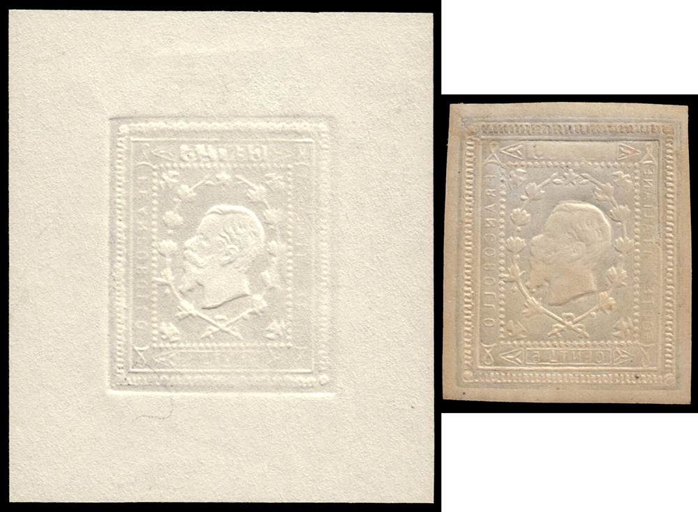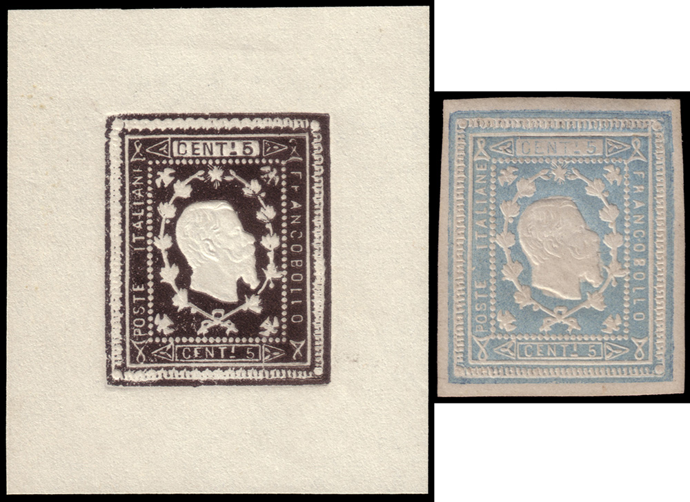 Giuseppe Re, Torino. 5c. celeste chiaro con effigie di Vittorio Emanuele II oltre a facsimile in nero
