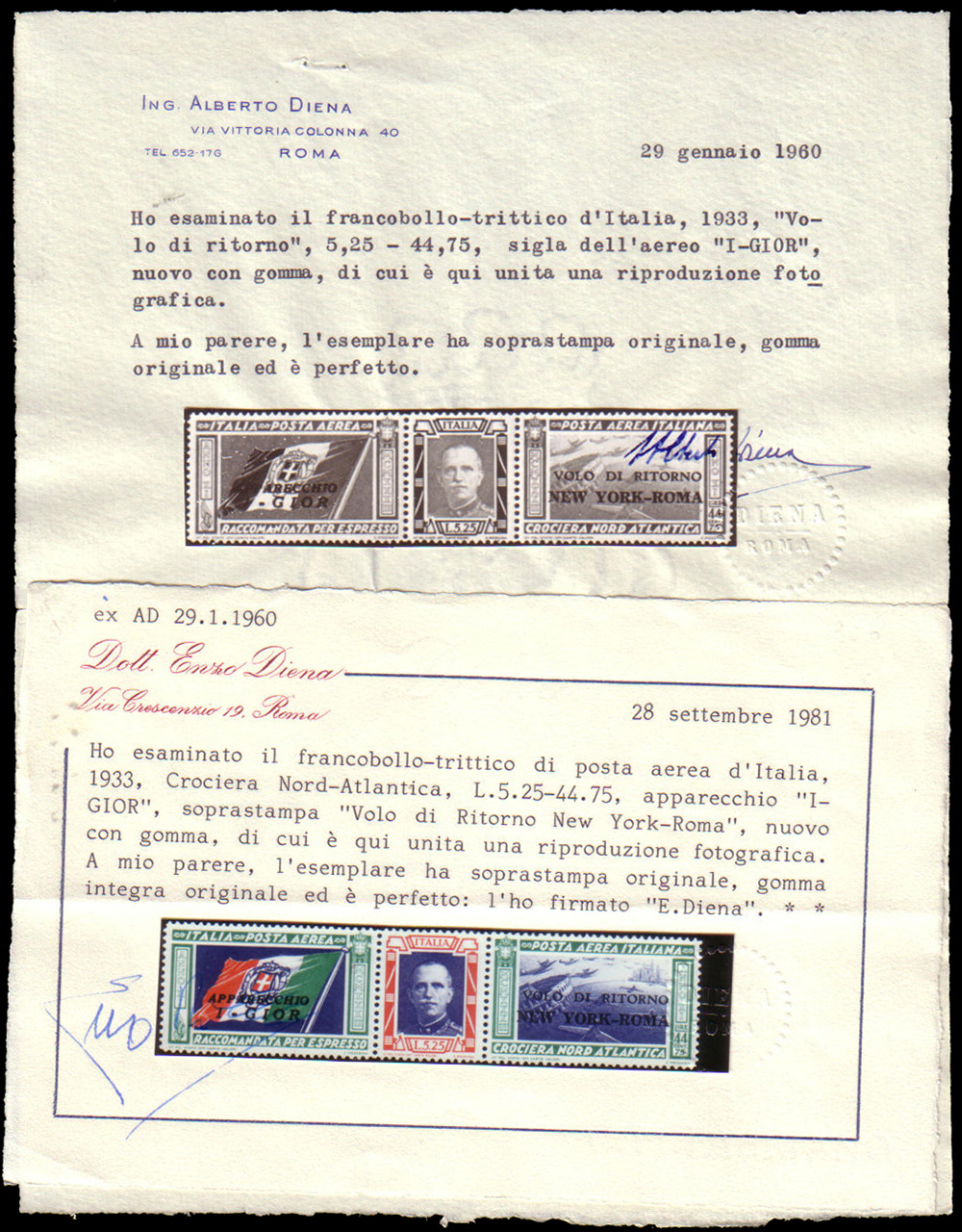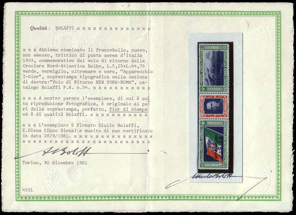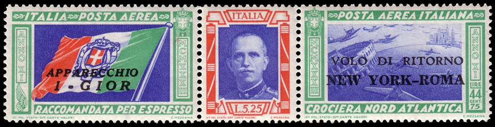 Posta aerea "Crociera del Decennale". Trittico 5,25+44,75 lire, non emesso, soprastampato "VOLO DI RITORNO / NEW YORK-ROMA", sigla I-GIOR