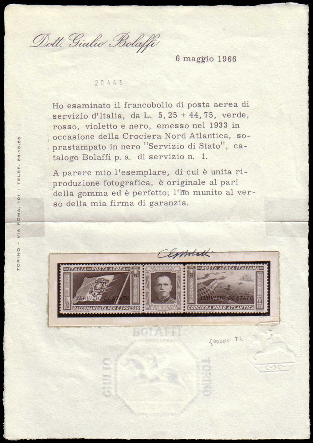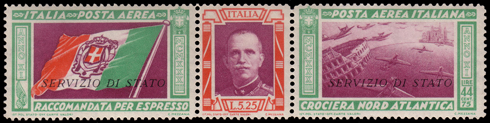 Posta aerea di servizio "Crociera del Decennale". Trittico 5,25+44,75 lire soprastampato "SERVIZIO DI STATO"