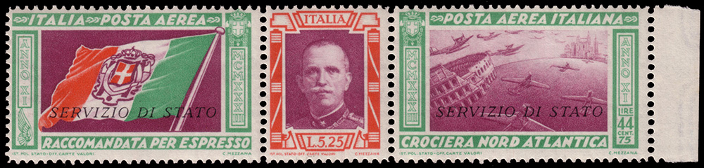 Posta aerea di servizio "Crociera del Decennale". Trittico 5,25+44,75 lire soprastampato "SERVIZIO DI STATO"