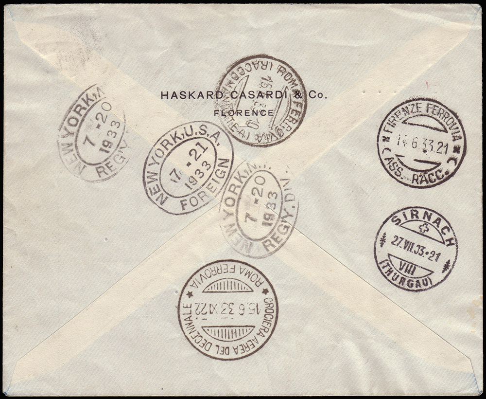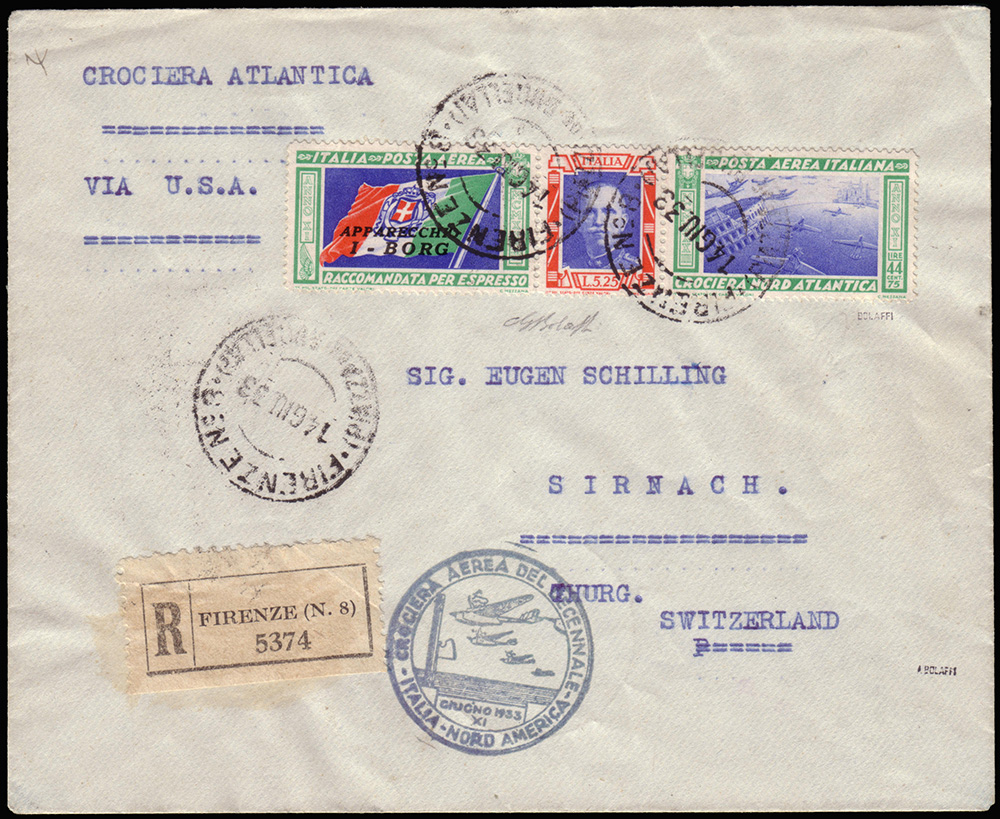 Airmail "Crociera del Decennale". Cover from Florence, via New York, to Sirnach (Switzerland), franked with trittico 5.25 + 44.75 lire I-BORG