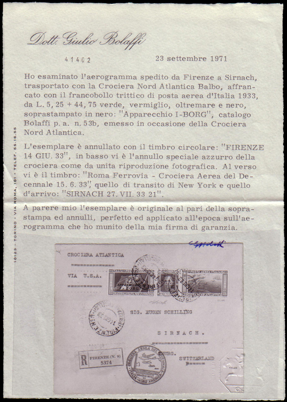 Posta aerea "Crociera del Decennale". Busta da Firenze, via New York, per Sirnach (Svizzera), affrancata con trittico da 5,25+44,75 lire sigla I-BORG