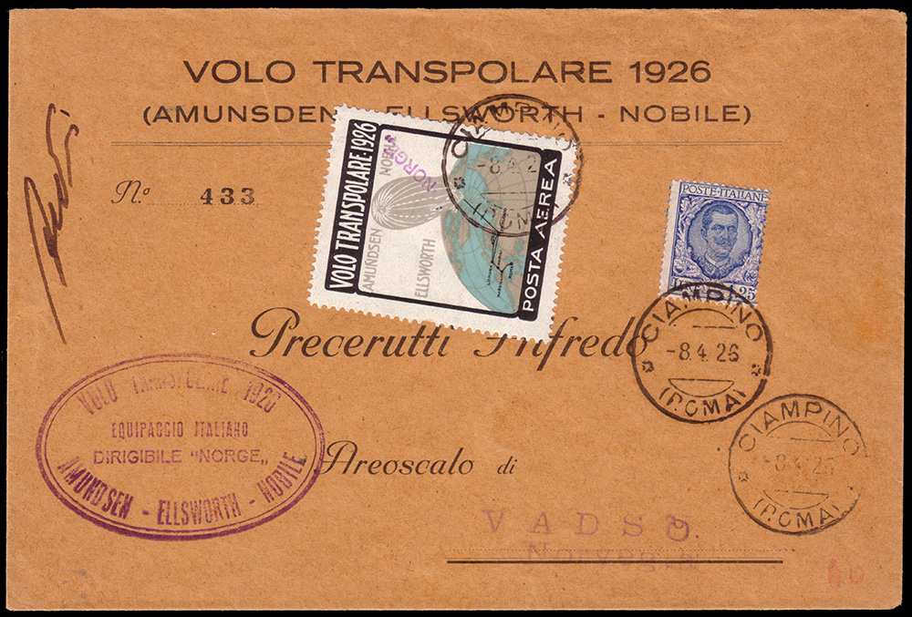 Posta aerea transpolare Nobile, dirigibile "Norge". Busta "gialla", firmata dal motorista Arduino, da Ciampino per Vadso (Norvegia) affrancata per 1,25 lire oltre a erinnofilo speciale