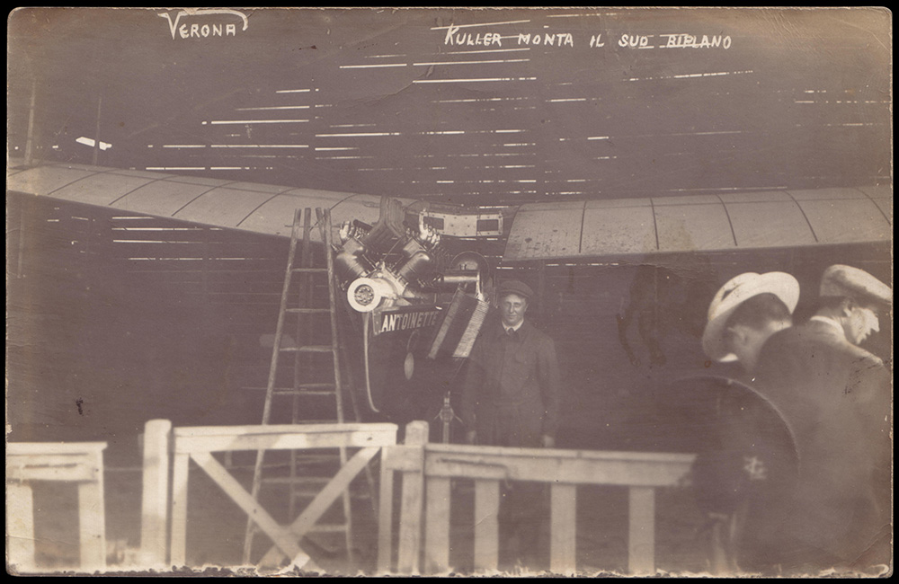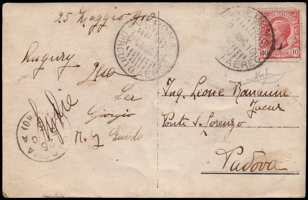Pionieri della posta aerea. Verona, Concorsi Aerei Internazionali. Cartolina fotografica "Kuller monta il suo biplano" da Verona per Padova (26.05), affrancata con 10c. "Leoni" annullato con timbro speciale "VERONA / CIRCUITO AEREO"
