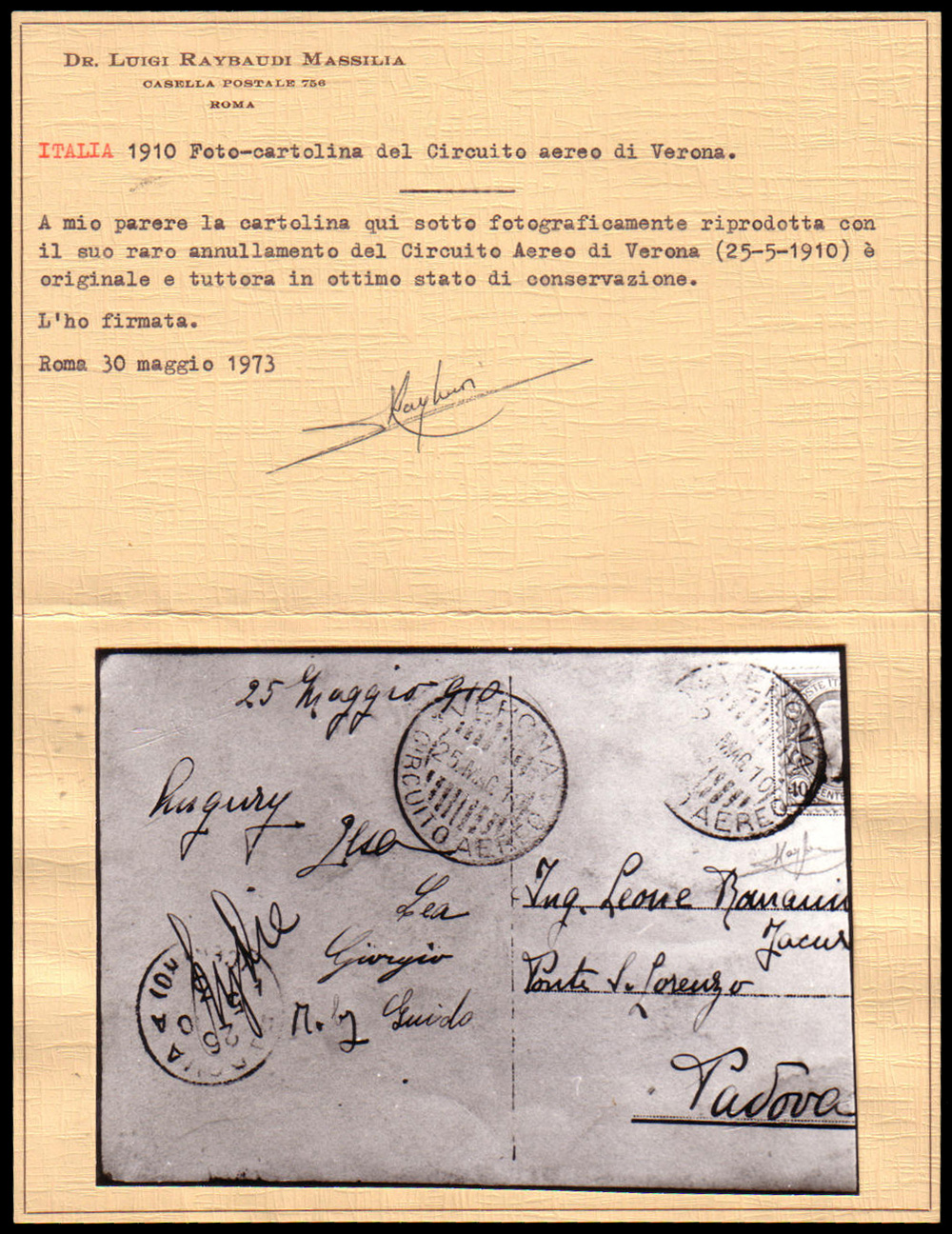 REGNO D'ITALIA 1910 (25 mag.)Pionieri della posta aerea. Verona, Concorsi...