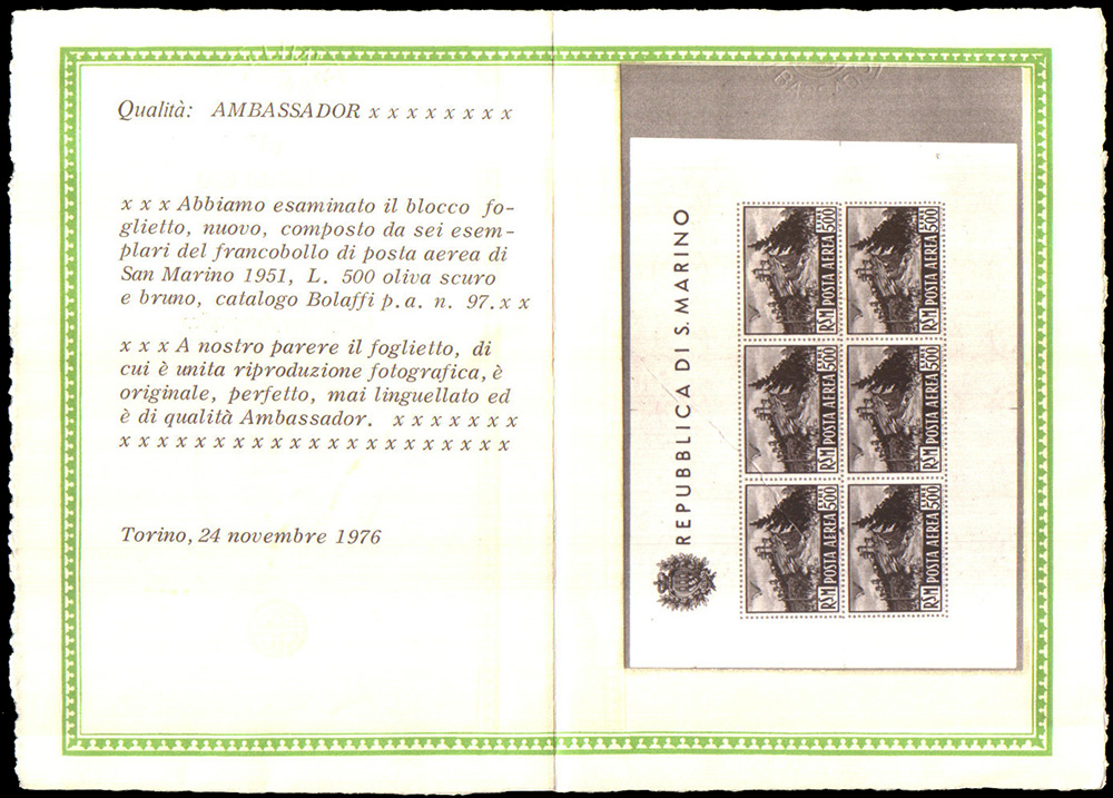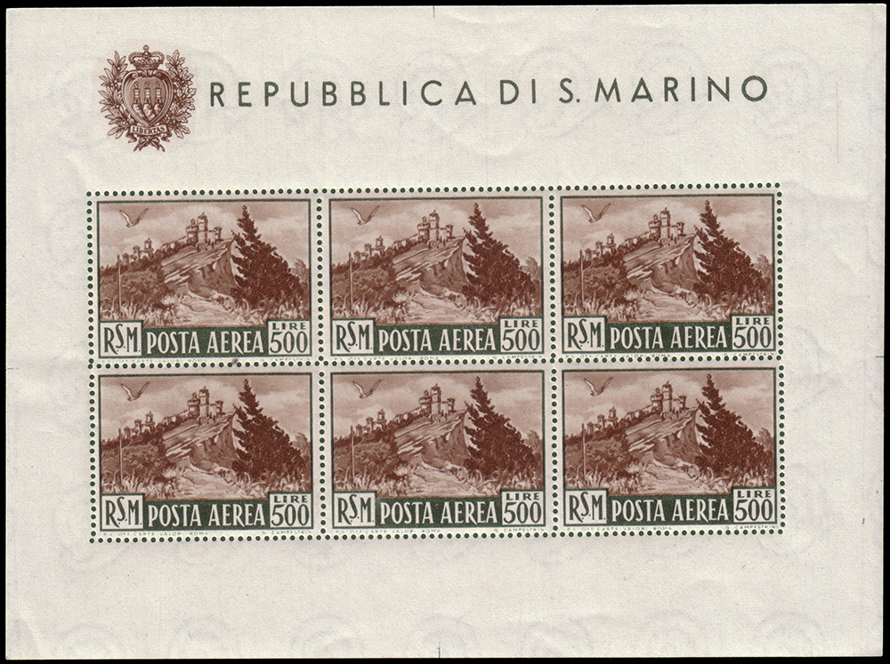 SAN MARINO 1951Foglietto posta aerea. 500 lire "Veduta"Cert....