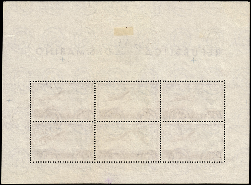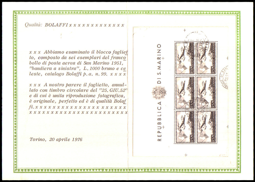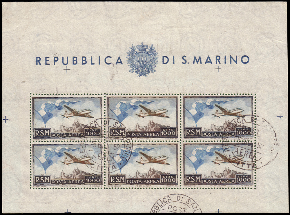 SAN MARINO 1951Foglietto posta aerea. 1000 lire "Bandiera, aereo e...