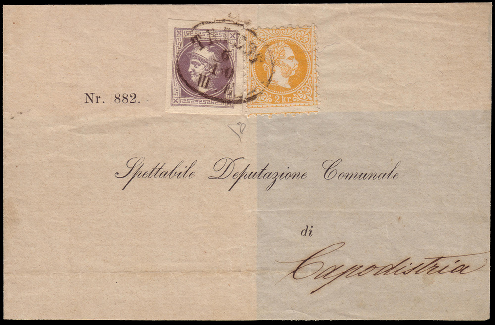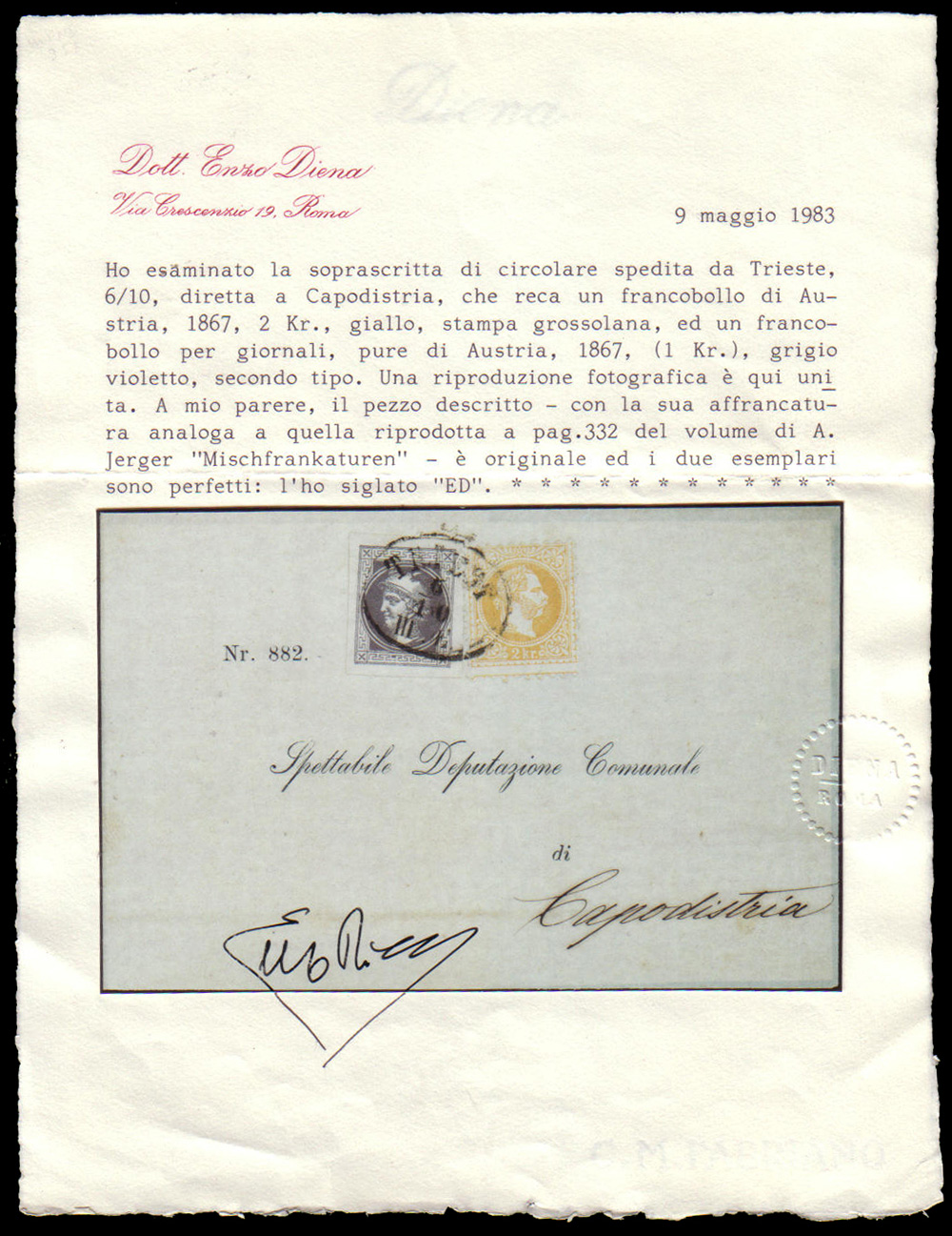 Circolare senza testo da Trieste per Capodistria, con affrancatura mista da 3Kr. composta da 2Kr. giallo, stampa grossolana e (1Kr.) grigio violetto II tipo per giornali