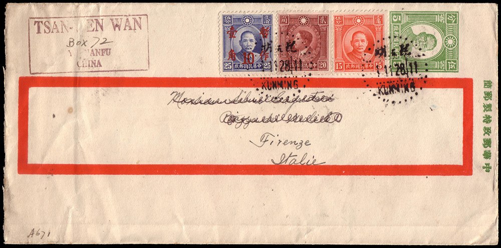 Lot 206 | CINA 1940 (1 nov.)Intero postale da 5c. da Kunning per Firenze con...