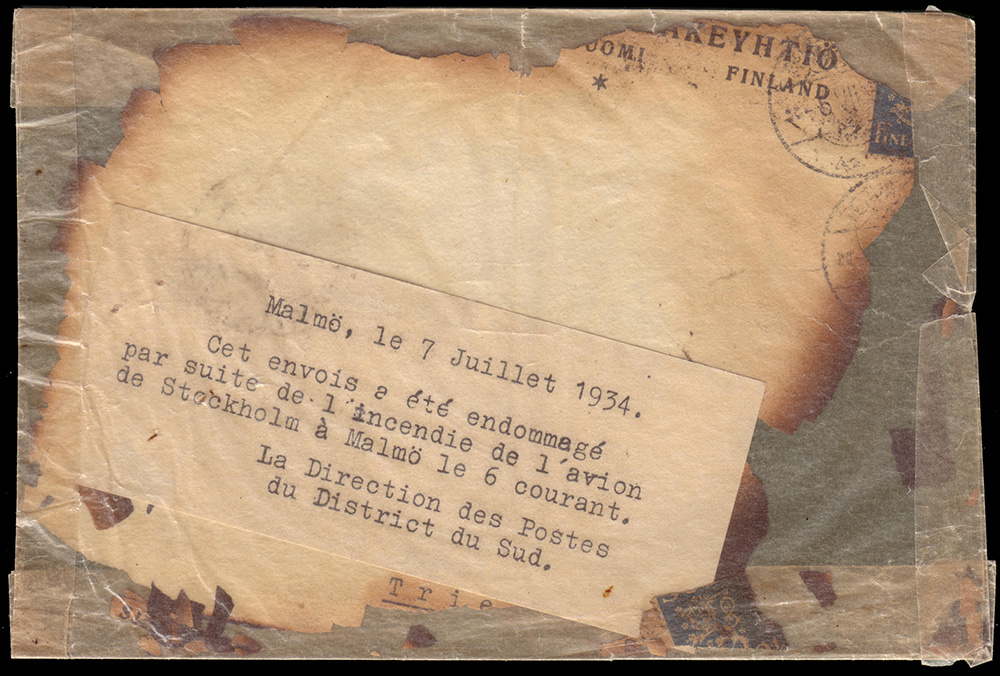Crash cover. Busta recuperata da incidente aereo della compagnia ABA e inserita in bustina di pergamino dall'amministrazione postale Svedese a Malmo. Etichetta in lingua francese "Malmö, le 7 juillet 1934. / Cet envois a été endommagé par suite de l'incendie de l'avion de Stockholm à Malmö le 6 courant. / La Direction des Postes / du District du Sud."