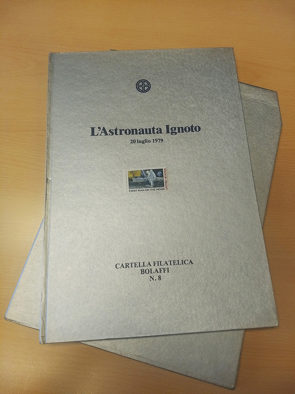Spazio, 10c. "Primo uomo sulla Luna", varietà "Astronauta ignoto, stampa del rosso della bandiera mancante". In album Bolaffi dedicato