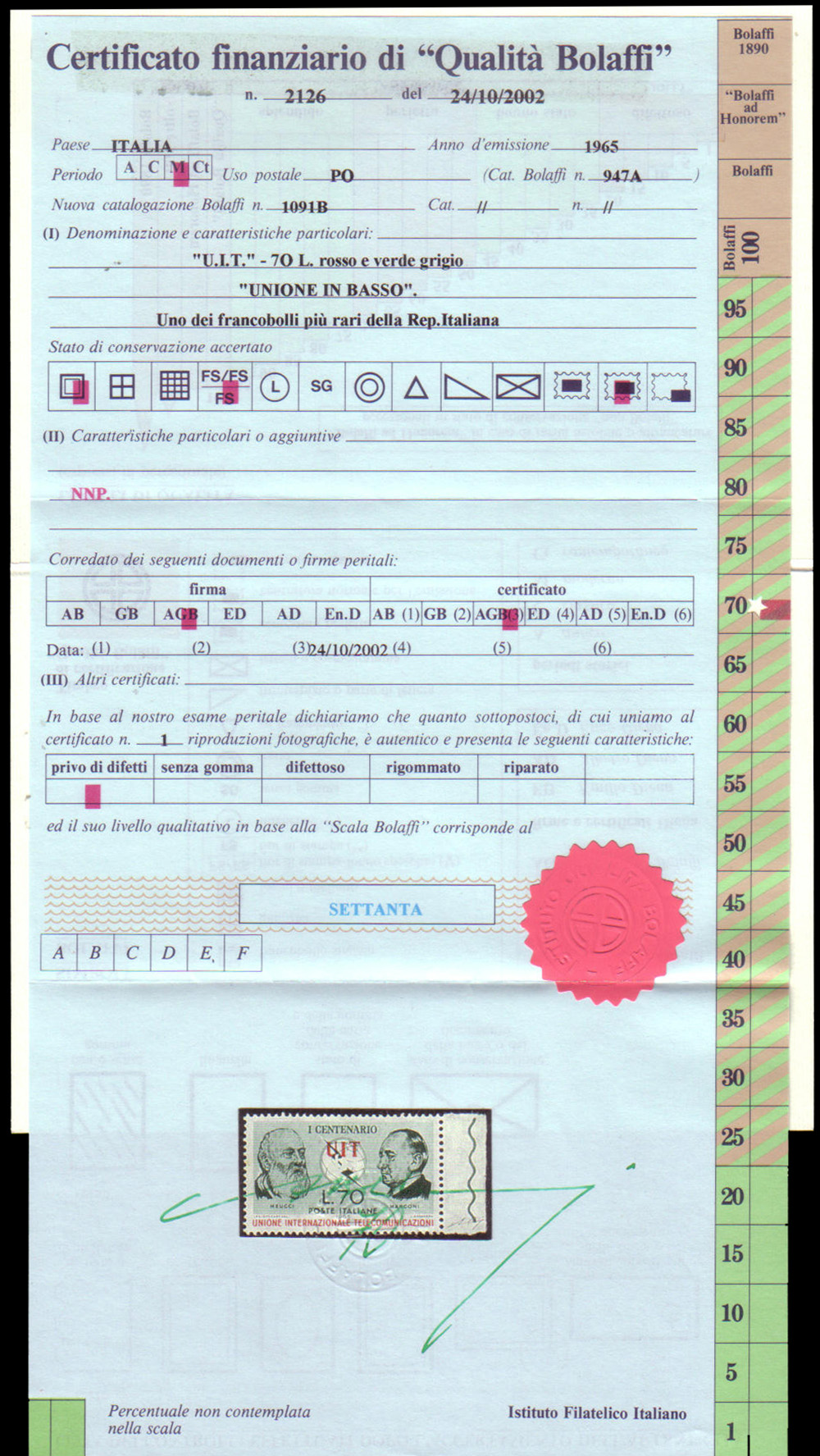 REPUBBLICA 1965Varietà. 70 lire "UIT" scritta in rosso in...