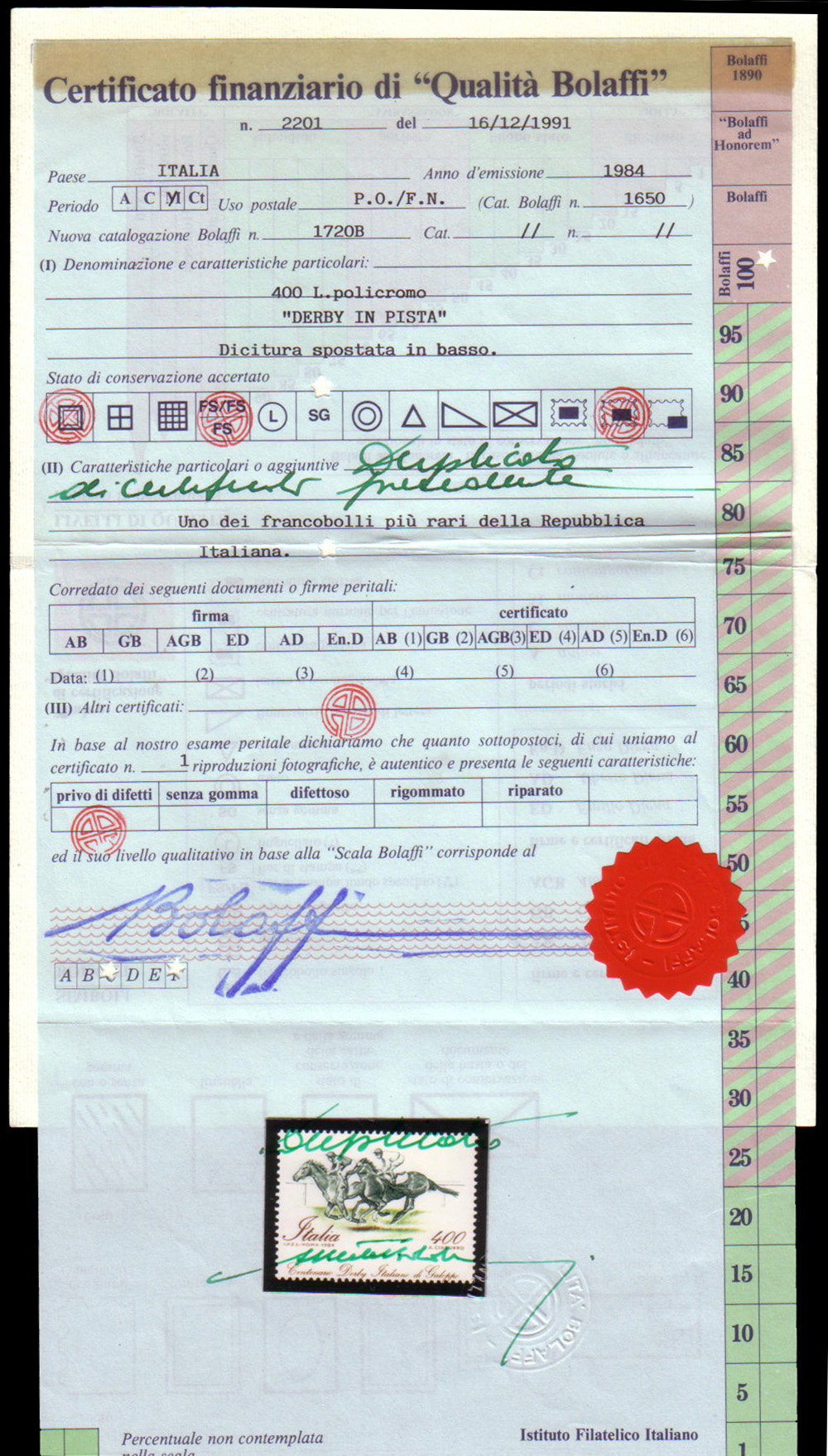 REPUBBLICA 1984Varietà. 400 lire "Derby in pista"ProvenienzaCollezione...