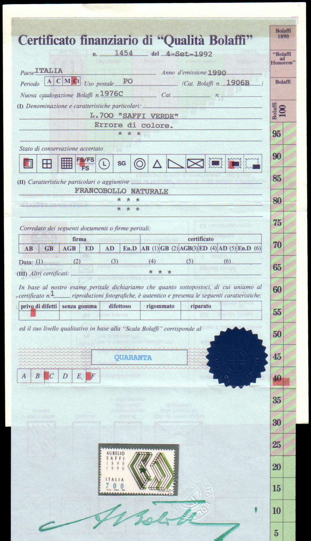 Lot 223 | REPUBBLICA 1990Varietà. 700 lire "Saffi verde"ProvenienzaCollezione...