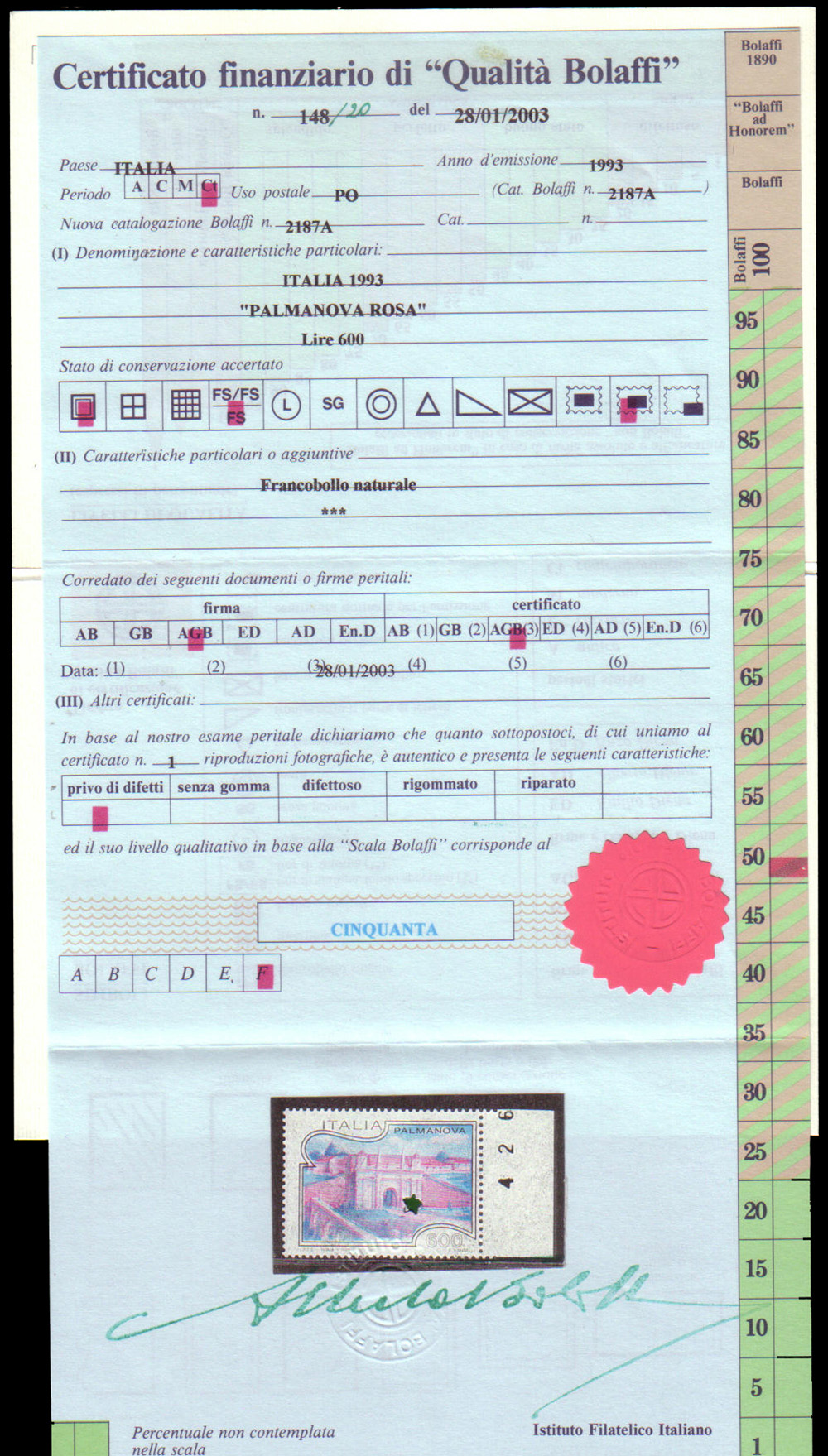 Lot 229 | REPUBBLICA 1993Varietà. 600 lire "Palmanova rosa"ProvenienzaCollezione...