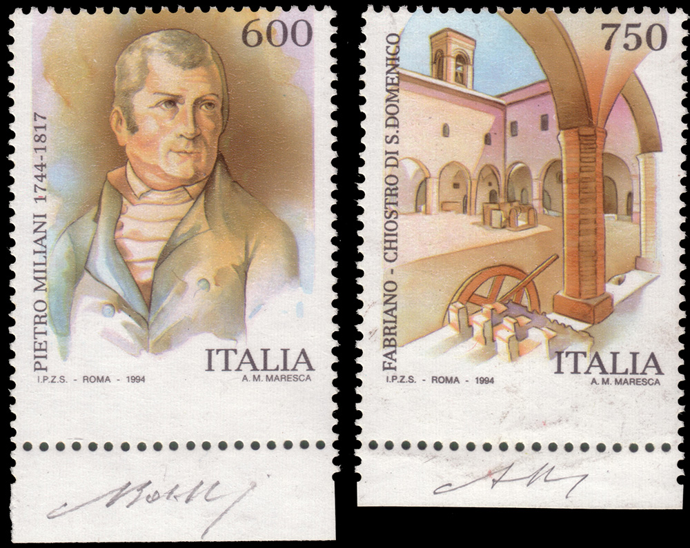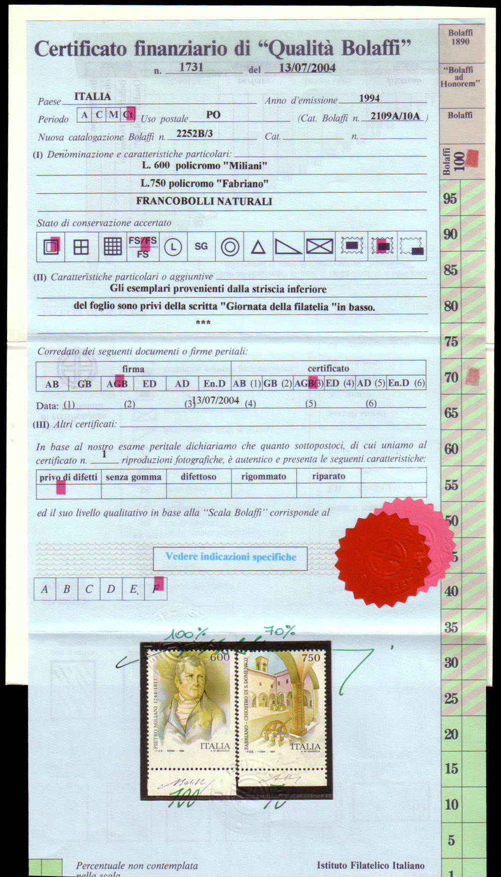 REPUBBLICA 1994Varietà. 600 e 750 lire "Miliani e Fabriano" dentellatura...