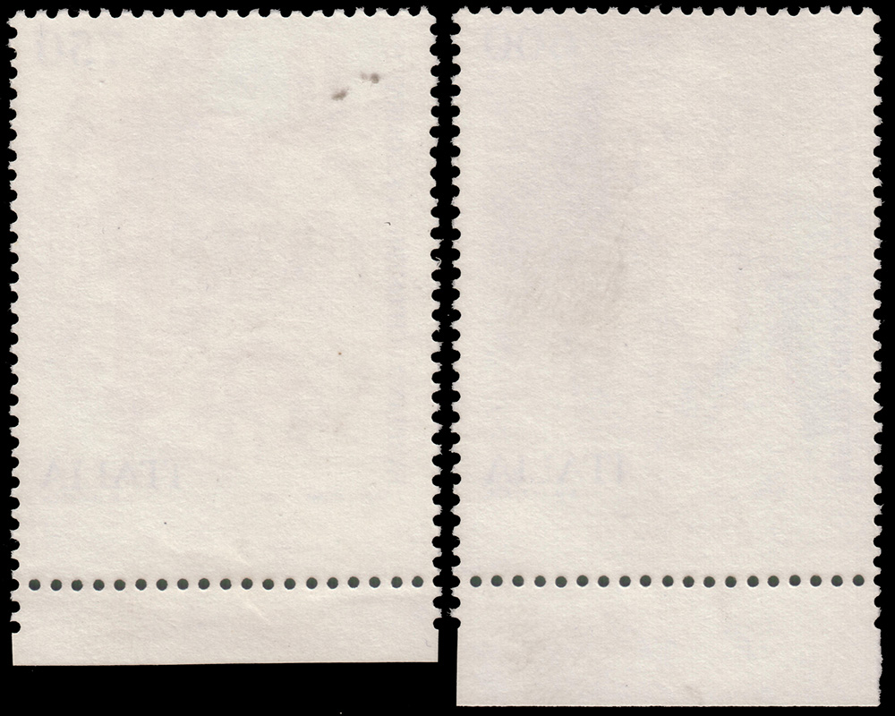 Varietà. 600 e 750 lire "Miliani e Fabriano" dentellatura spostata, senza scritta "Giornata della filatelia"