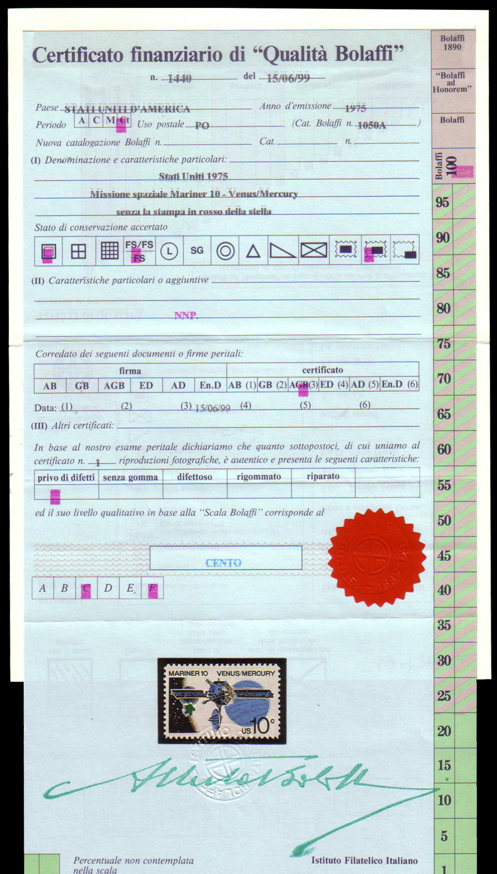 STATI UNITI 1975Varietà. 10c. "Mariner II" privo della stampa in rosso,...