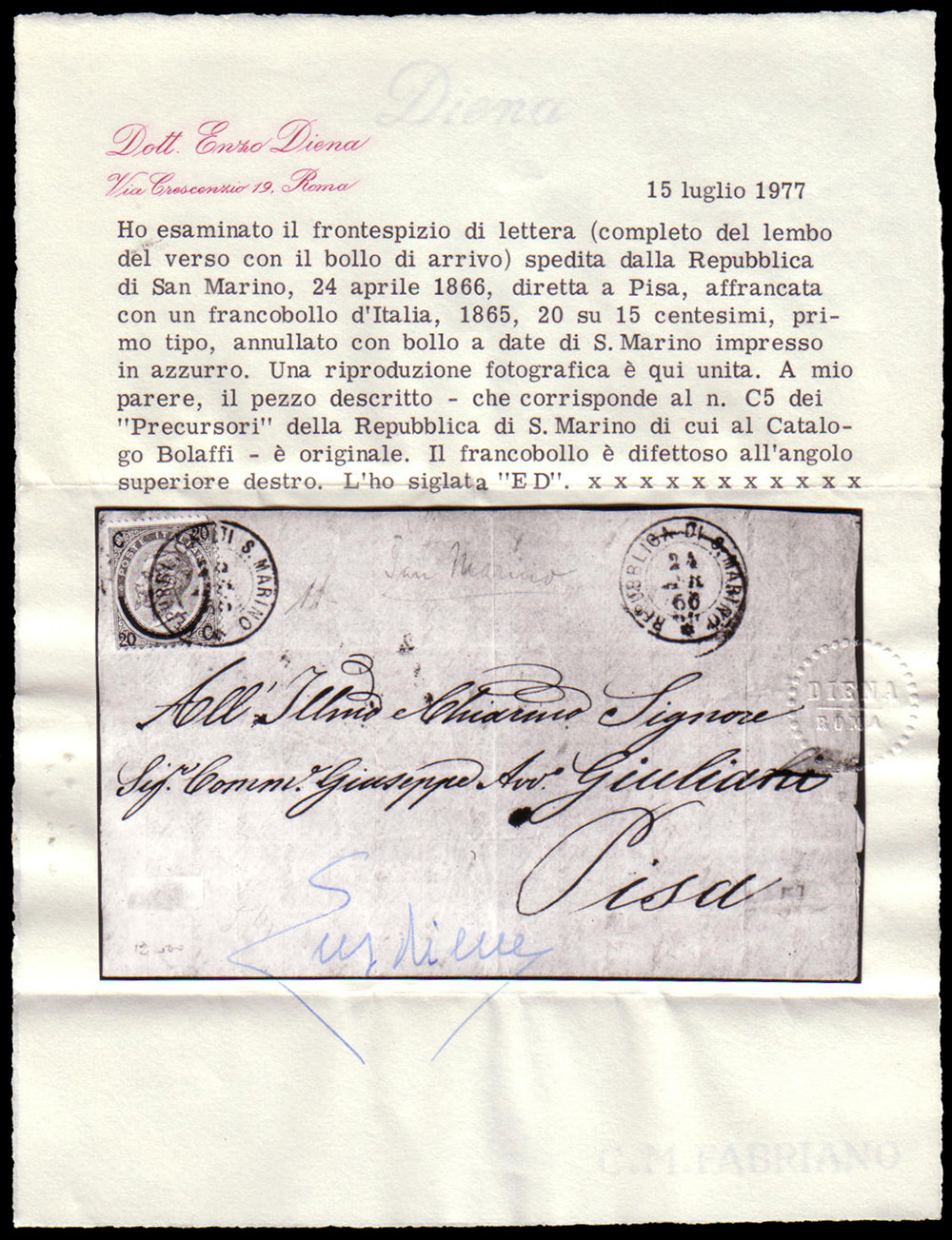 Insieme di 2 lettere e un frontespizio con annullo di arrivo affrancate con esemplari del Regno d'Italia annullati a San Marino. Un certificato. Da esaminare