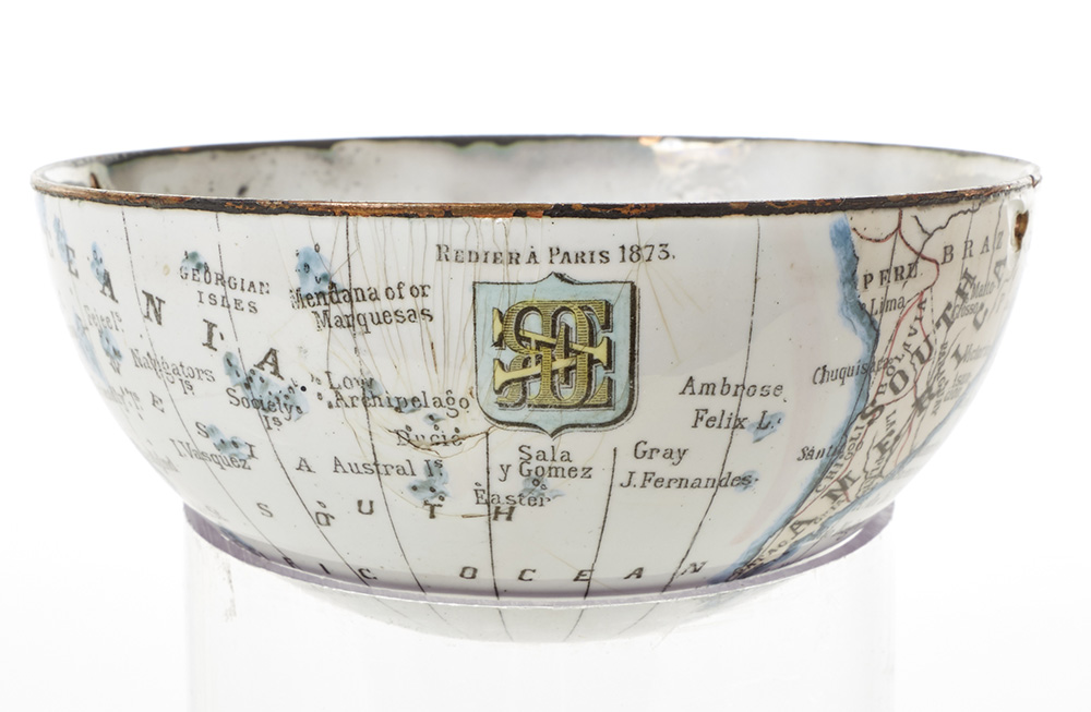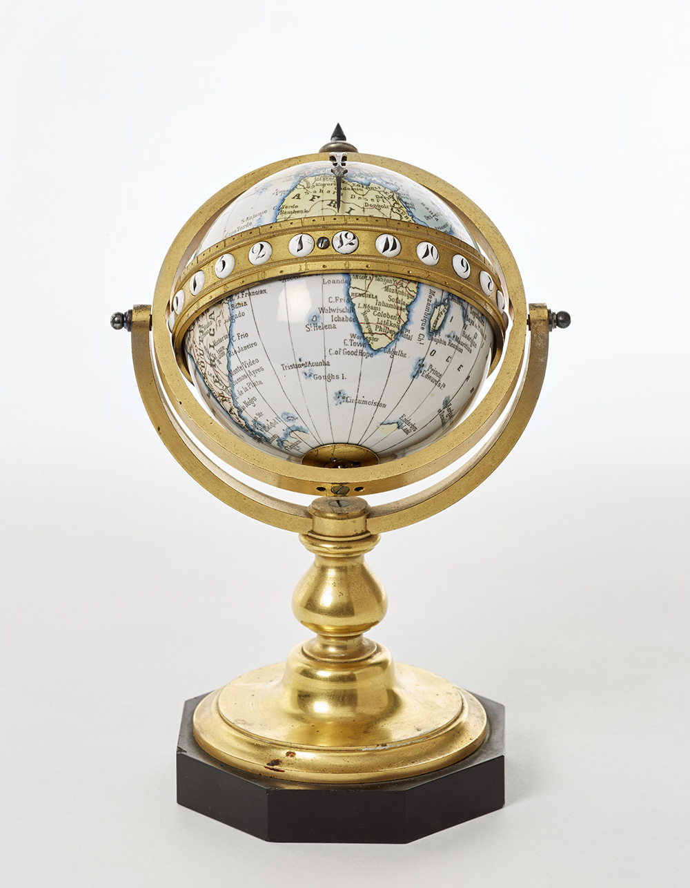 It is composed of an enamel terrestrial globe with a brass equatorial ring and is subdivided in 24 enamelled cartouches indicating the hours in two series of 12. on the same ring notches for the minutes and different time zones subdivided in meridians.