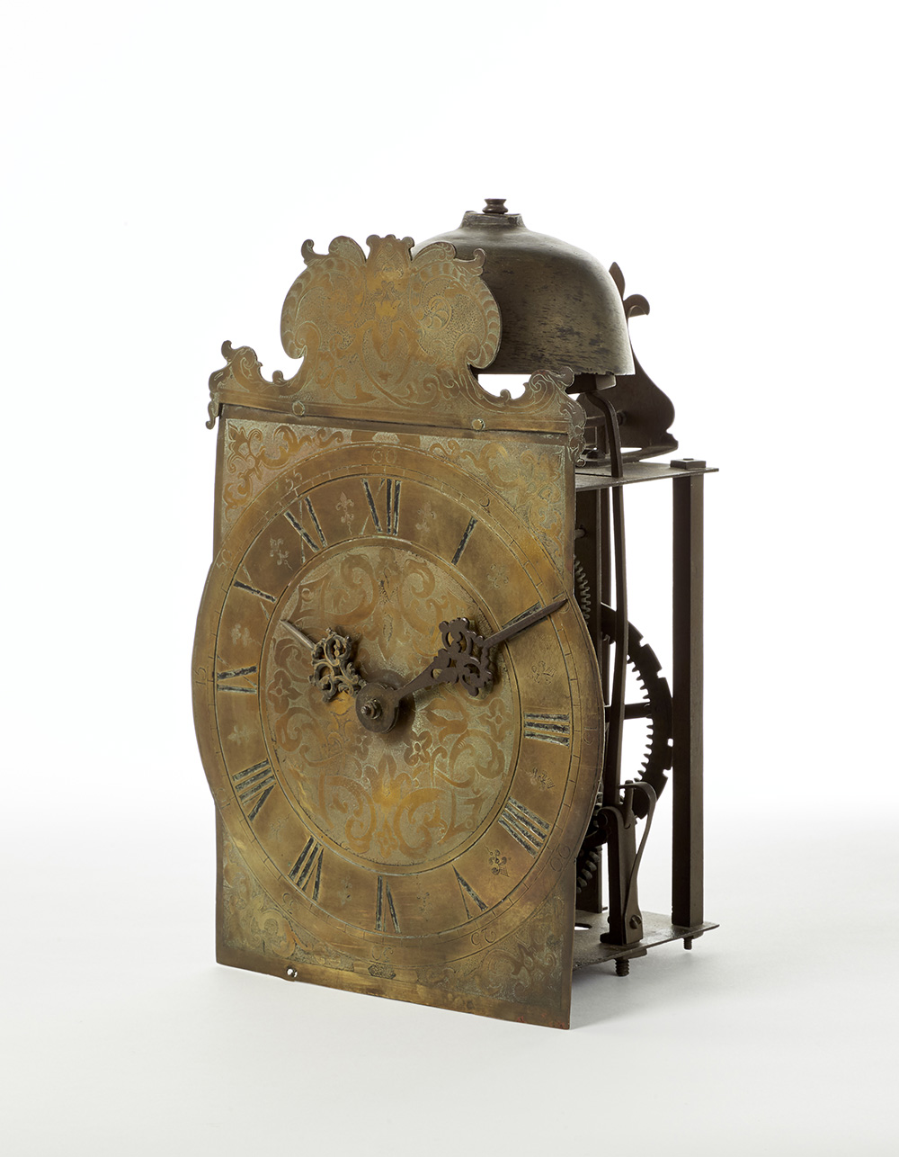 Orologio a lanterna in ottone e ferro, nella parte posteriore della cimasa incisa la data 1754