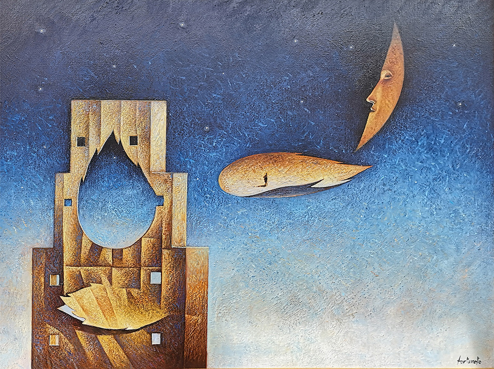 Franco Fortunato Roma 1946 Quarto piano sull'infinito (Racconti per l'Europa) olio su tela 100 x 120