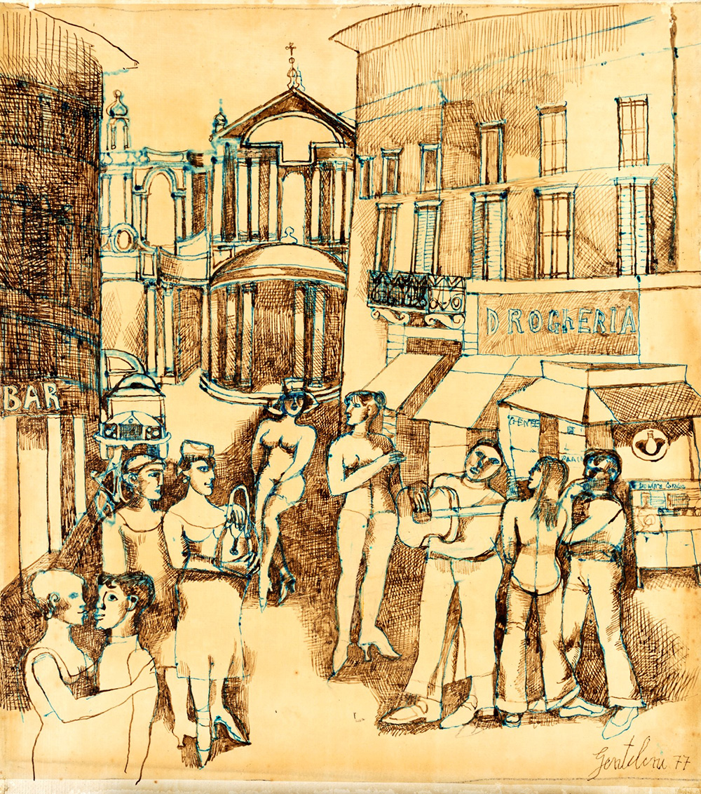 Franco Gentilini Faenza 1909-Roma 1981, Il Caffè della Pace 1977 Tecnica mista su carta applicata su tela cm 37x32,5 Firma e data i basso a destra "Gentilini '77".