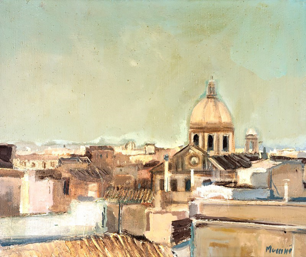 Marcello Muccini Roma 1926-Roma 1978, TETTI DI ROMA Olio su tela cm 50x60 Firma sul fronte. Sul retro timbro della galleria La Barcaccia