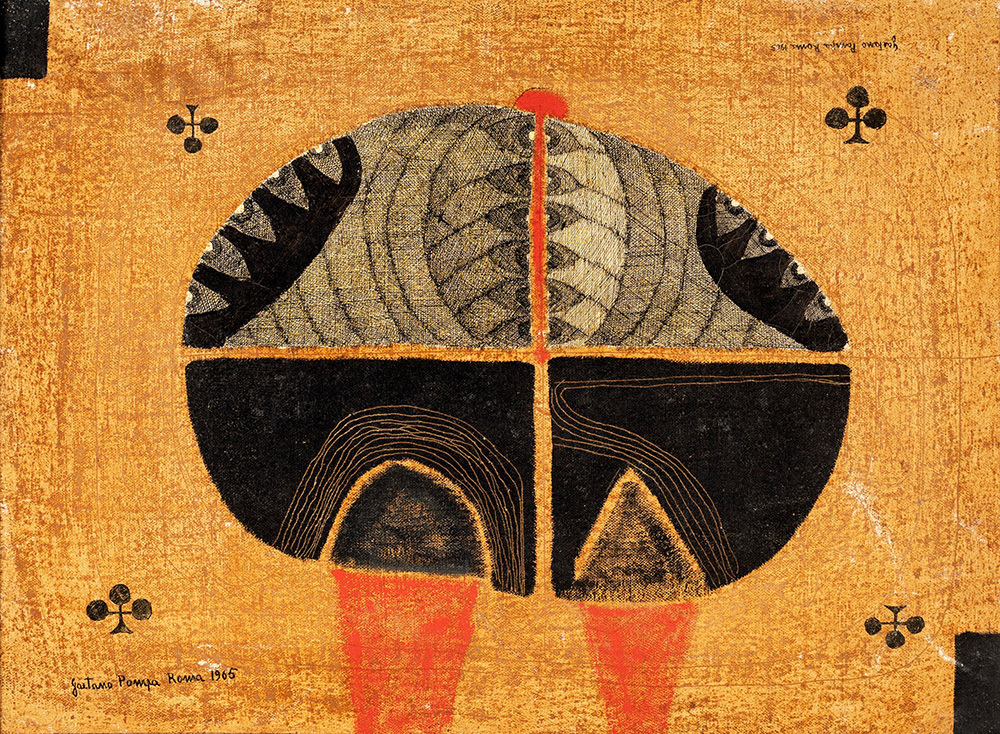 Gaetano Pompa Forenza 1933-Orbetello 1998, Senza titolo 1965 Olio, collage, penna e china su tela cm 50x70 Firmato e datato due volte sul fronte.
