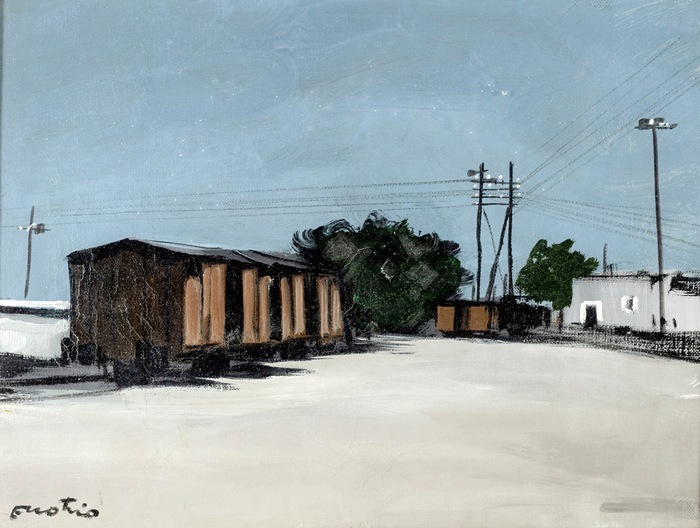 Enotrio Pugliese Enotrio Buenos Aires 1920-Pizzo 1989, Binario morto Olio su masonite cm 30x40 Firma sul fronte "Enotrio". Al verso reca titolo e firma.