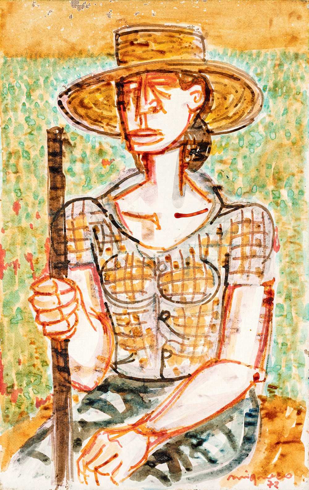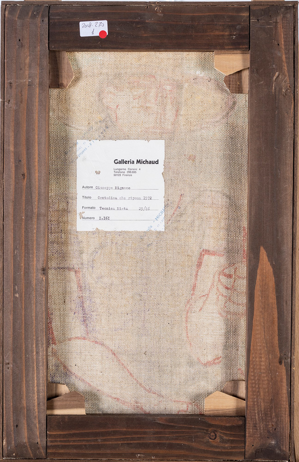 Giuseppe Migneco Messina 1903-Milano 1997, Contadina che riposa 1972 Tecnica mista su carta applicata su tela cm 46x29 Firma in basso a destra Migneco '72. Al verso reca etichetta della Galleria Michaud