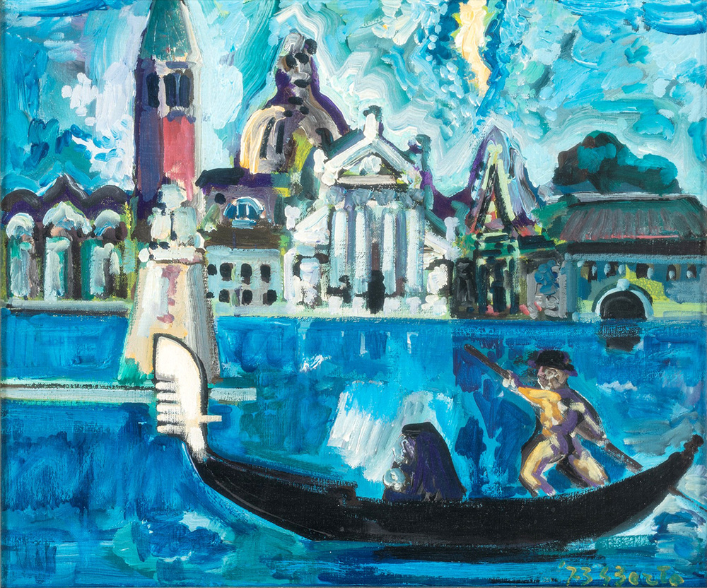 Gianpaolo Berto Adria 1940-0, La fuga in Egitto 1973 Olio su tela cm 50x70 Sul fronte firma e data "'73 G. Berto". Al verso reca titolo, firma e data.