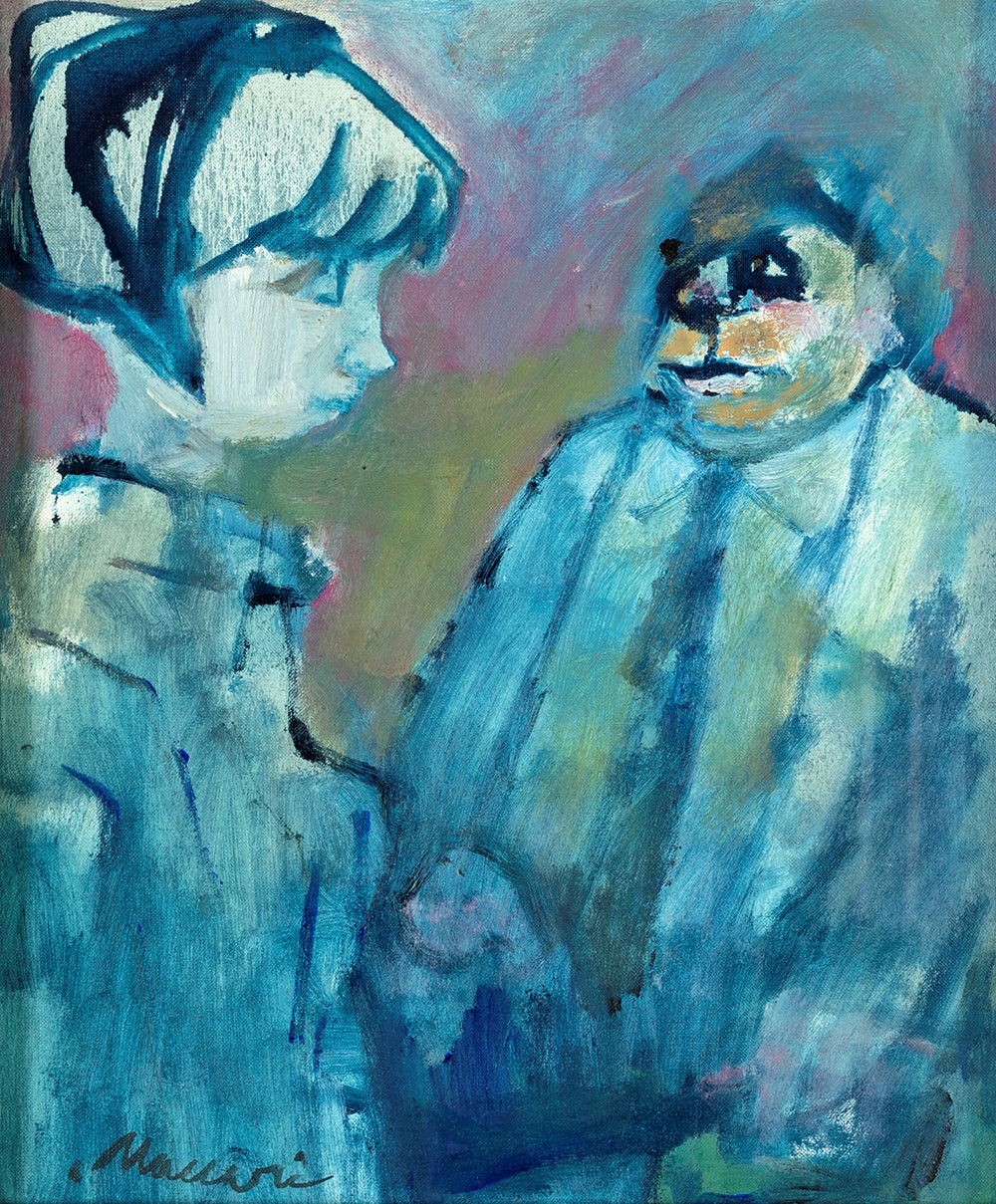 Mino Maccari Siena 1898-Roma 1989, Figure Olio su cartone telato cm 30x25 Firma sul fronte "Maccari". Al verso reca etichetta Galleria D'Arte Margutta (Pescara).