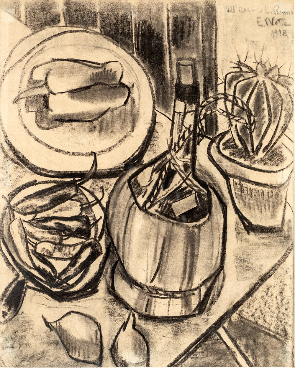 Emilio Notte Ceglie Messapica 1891-Napoli 1982, Natura Morta 1918 Carboncino su cartone cm 57,5x46 Firma e data in alto "E.Notte 1918".